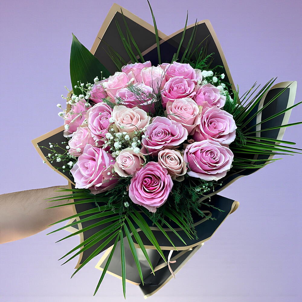 Pastel tonlardaki güller ve zarif cipso çiçekleriyle süslenen bu buket, sevgi ve inceliği simgeler. Şık siyah ve altın detaylı ambalajıyla modern ve etkileyici bir görünüm sunar.