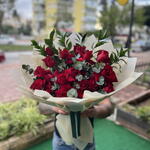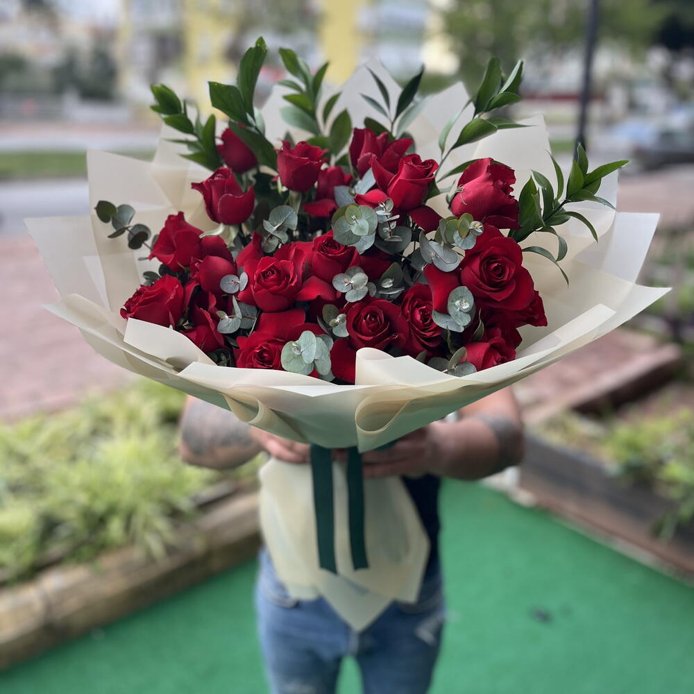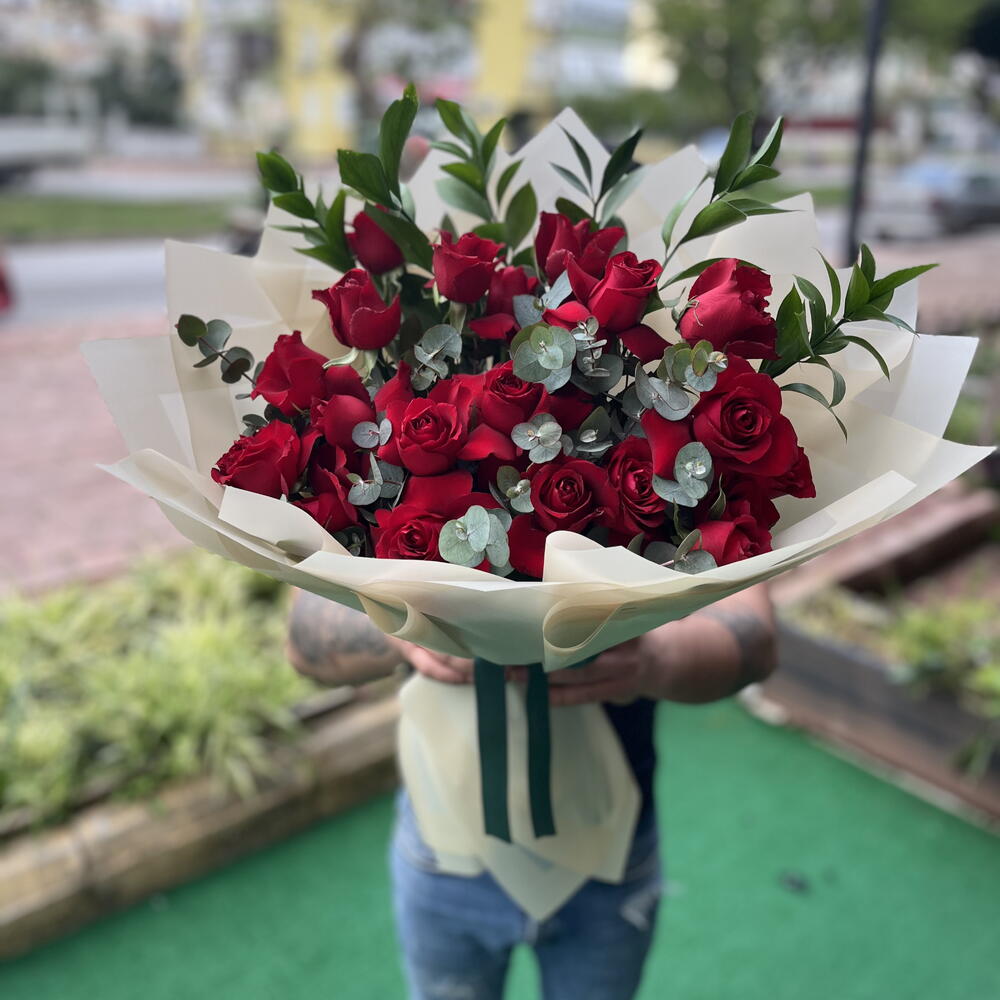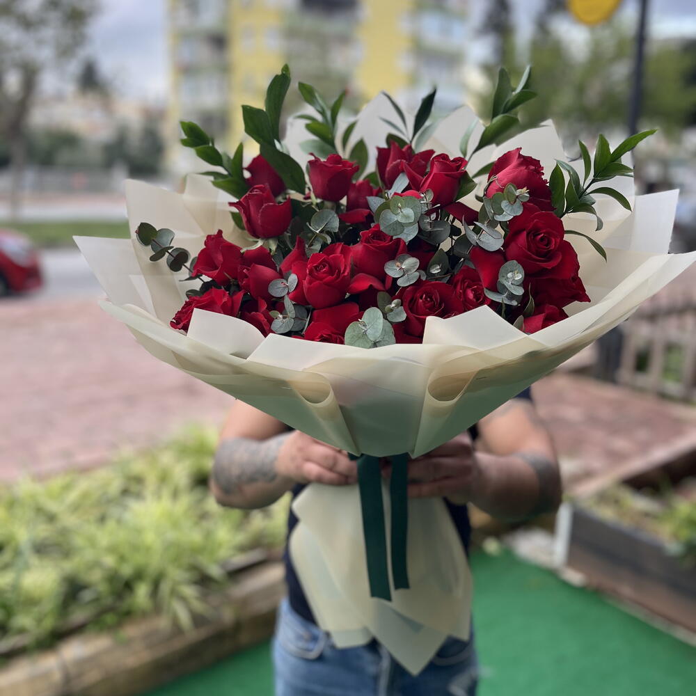 Tabii! Bu şık ve romantik kırmızı gül buketi için etkileyici bir ürün tanıtım metni hazırladım: ⸻ “Klasik Aşkın Zamansız Hali” Aşkın en güçlü simgesi olan kırmızı güller, bu zarif bukette şıklıkla buluşuyor. Eucalyptus yapraklarının modern dokunuşu ve doğal yeşilliklerle desteklenen bu aranjman, duygularınızı anlatmanın en estetik yolu olacak. Sade ama etkileyici, klasik ama her zaman özel… İçeriği: • 21 adet kırmızı gül • Ocaliptus yaprakları • Canlı yeşillikler • Krem rengi ambalaj ve koyu yeşil kurdele detayı Kullanım Alanları: Sevgililer Günü, yıldönümü, özür dileme, teklif anı ya da sadece “Seni seviyorum” demek için..