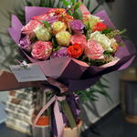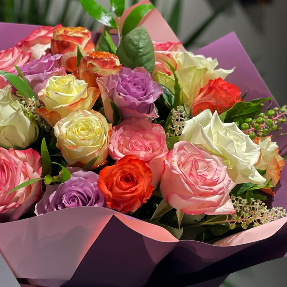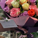 25 renkli gülden oluşan şık ve etkileyici bir buket tasarımı. Yaklaşık ürün yüksekliği: 50 cm.