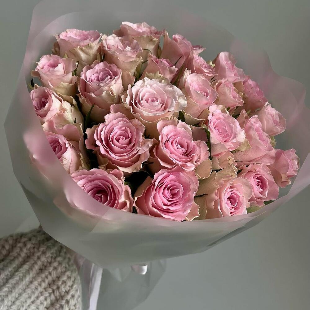 Elegant and classic bouquet of 25 fresh pink roses, 40-50 cm. A free flower card with every bouquet. As seen in the product image, it is produced from fresh large and lively 1st class flowers.