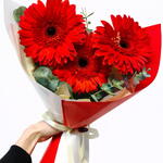 Kırmızı ve Beyaz renklerde ambalaj kağıdı içerisinde hazırlanan 3 adet Gerbera ve Okaliptus yapraklarından yapılmış buket.