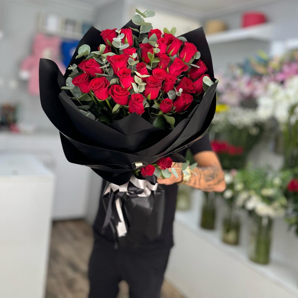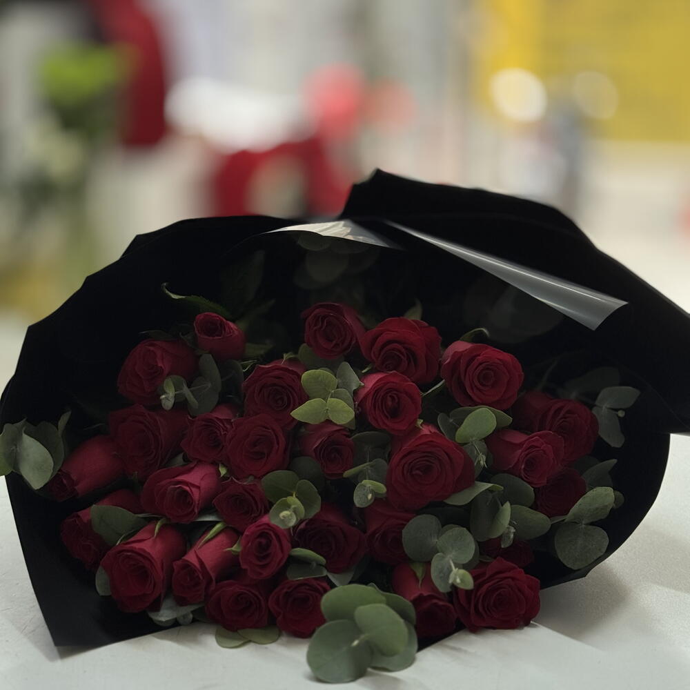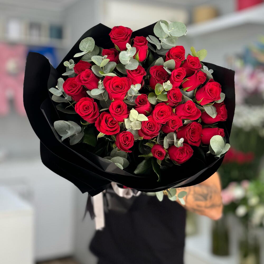 okaliptüs - 25 adet kırmızı gül - 35 adet