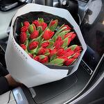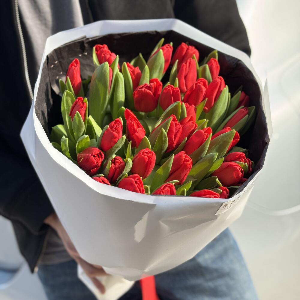 Bu büyüleyici çiçek buketi, özenle seçilmiş 35 adet canlı kırmızı lalelerden oluşmaktadır. Her bir lale, doğanın eşsiz güzelliklerini yansıtır ve bu buket, muhteşem bir armağan veya masa düzenlemesi olabilir. Mükemmel bir şekilde bağlanmış ve sunulmuş, bu kırmızı lale buketi her yerde güzellik ve neşe yaymayı vaat eder.