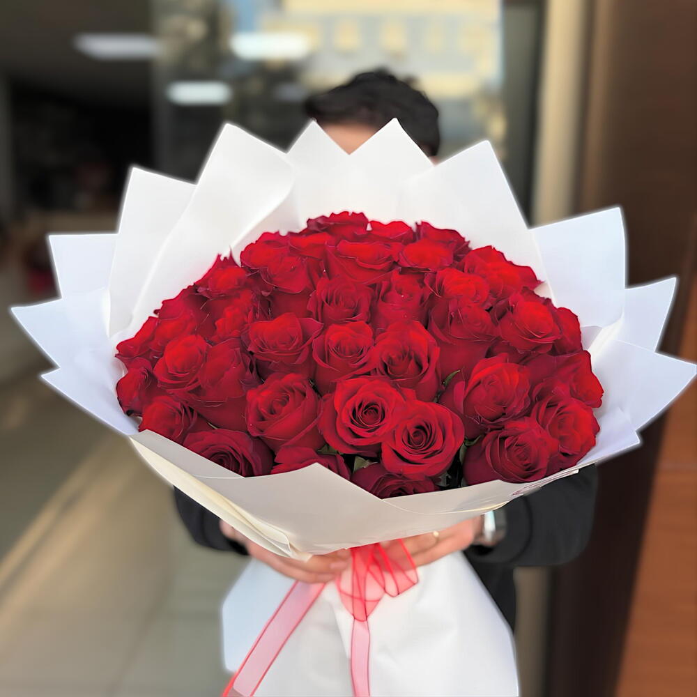 41 adet kırmızı gülden oluşan bu çiçek buketi, zarif bir şekilde 4 adet ambalaj ile paketlenmiştir ve son bir dokunuş olarak da 1 adet kurdele eklenmiştir. Bu özenle hazırlanmış buket, sevdiklerinize olan aşkınızı ve değerinizi anlatmanın en güzel yolu olacaktır. Her bir gül, hikayenizi anlatacak ve buket, herhangi bir özel günü unutulmaz kılacak.