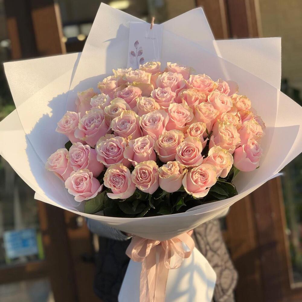 Elegant and classic bouquet of 41 fresh pink roses, 50-60 cm. A free flower card with every bouquet. As seen in the product image, it is produced from fresh large and lively 1st class flowers.