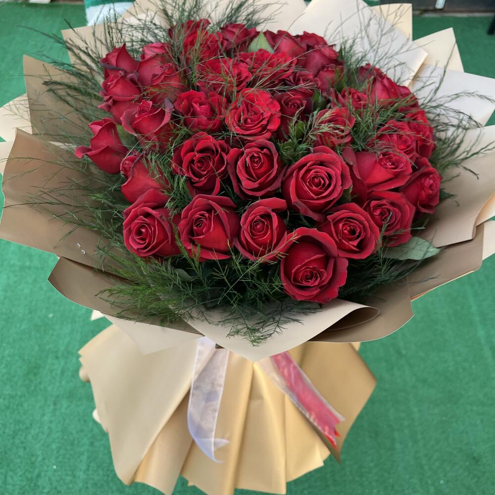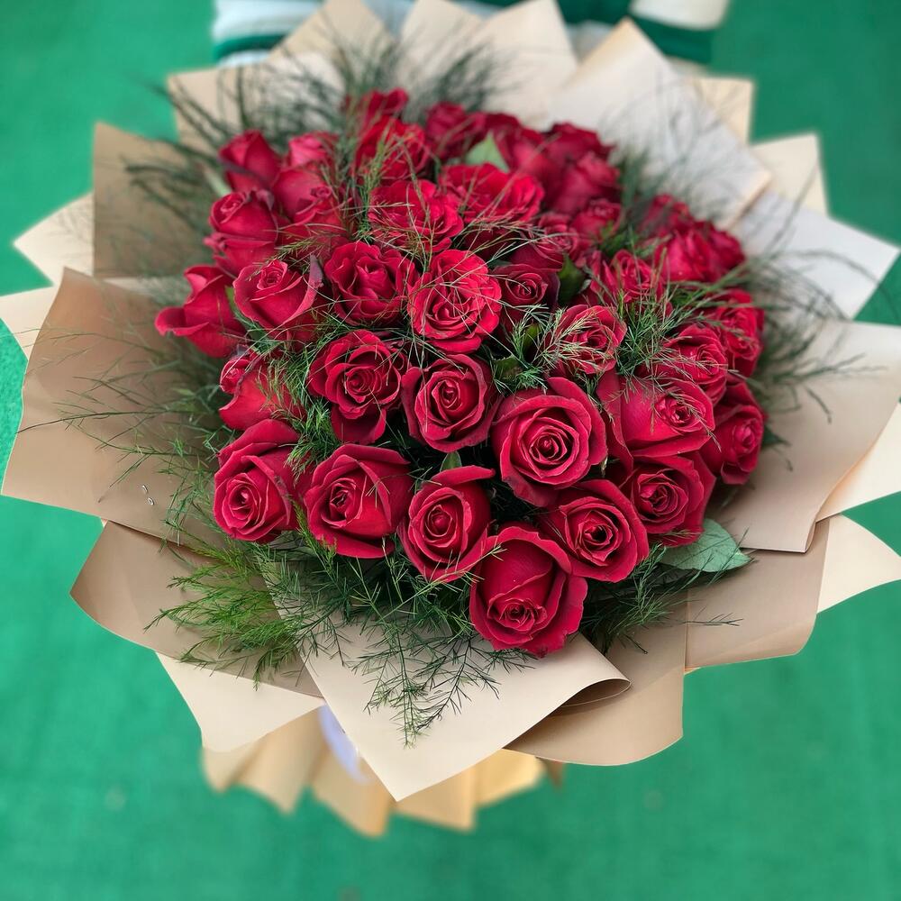 Bu muhteşem çiçek buketi, tutkunun ve aşkın simgesi olan 41 adet kırmızı gül ve yemyeşil yapraklarıyla dikkat çeken 1 adet greeny içerir. Her biri özenle seçilmiş bu çiçekler, size veya sevdiklerinize sunulan zarif bir hediye olan bu büyüleyici buketi oluşturmak için bir araya getirilmiştir.