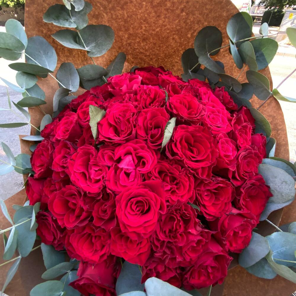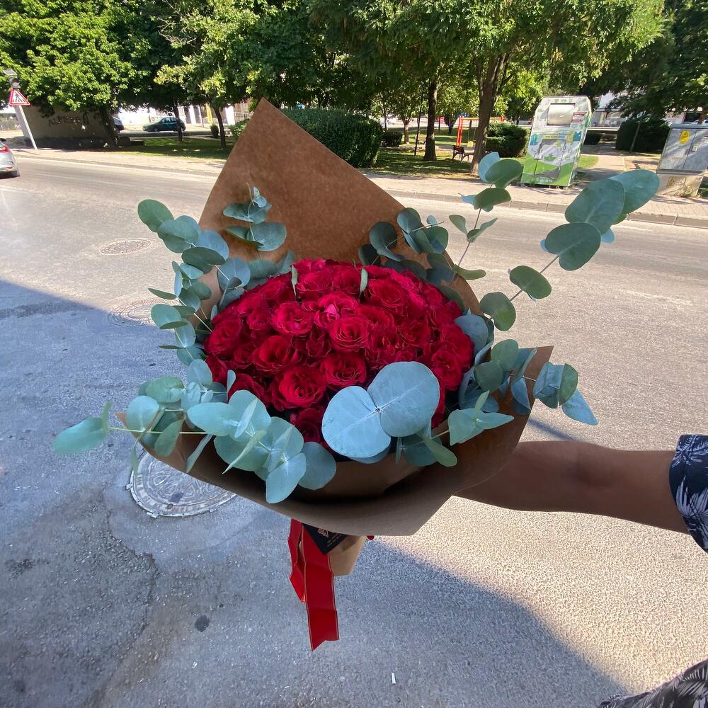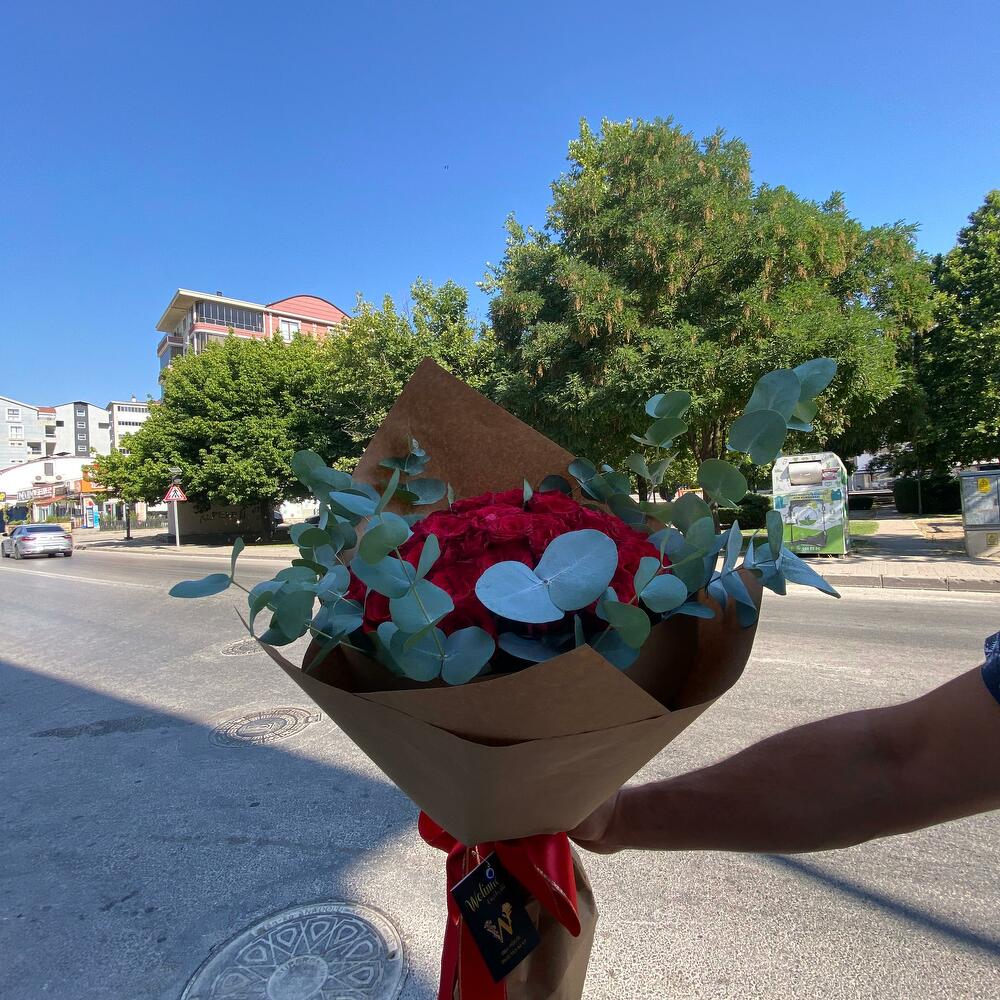 kırmızı gül buketi - 51 adet okaliptüs dalı - 10 adet