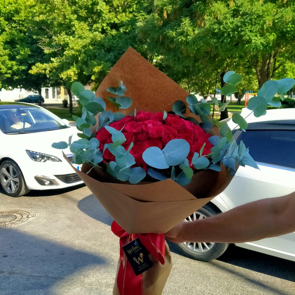 Bu büyüleyici çiçek buketi, aşk ve tutkunun simgesi olan 51 adet kırmızı gül ve taze bir dokunuş için 10 adet okaliptüs dalı içerir. İdeal bir hediye seçeneği olarak kabul edilir, bu set sadece romantik anları değil, aynı zamanda özel günleri de ölümsüz kılar. Bu etkileyici bir buketin sahibi olan kişi, sevdiklerinden ne kadar önemli olduğunu anlayacaktır.