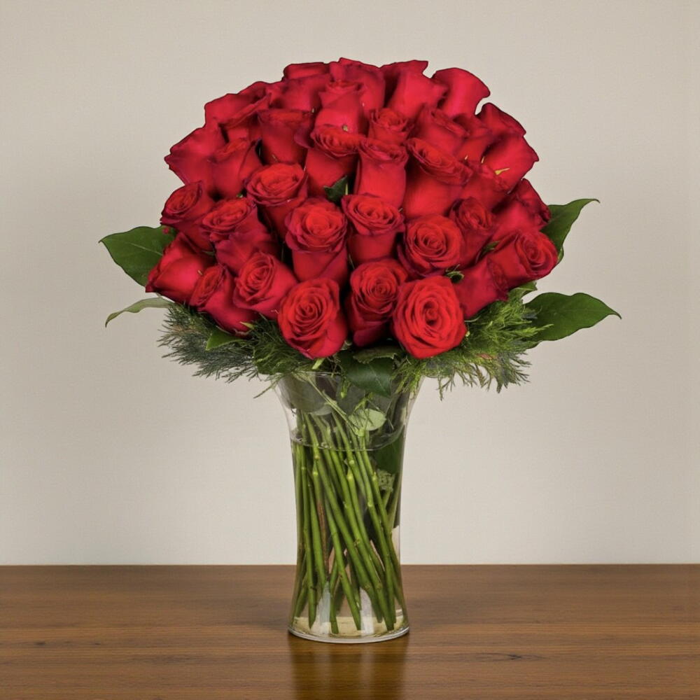 Bu zarif aranjman, kırmızı güllerin büyüleyici ihtişamını şık bir cam vazoda bir araya getirerek unutulmaz bir hediye haline geliyor. Yoğun ve dolgun yerleşimi, sevginin güçlü ve tutkulu ifadesini simgelerken, taze yeşillikler bukete doğal bir denge katıyor. Kırmızı güllerin kadifemsi dokusu ve zengin rengi, her ortamda dikkat çekici bir güzellik sunuyor. Özel günler, yıldönümleri veya romantik sürprizler için ideal bir seçenektir. Buketin tazeliğini koruması için suyu her gün yenilemeniz, sap uçlarını hafifçe kesmeniz ve vazoyu direkt güneş ışığından uzak tutmanız önerilir. Böylece gülleriniz daha uzun süre canlı ve etkileyici görünür.