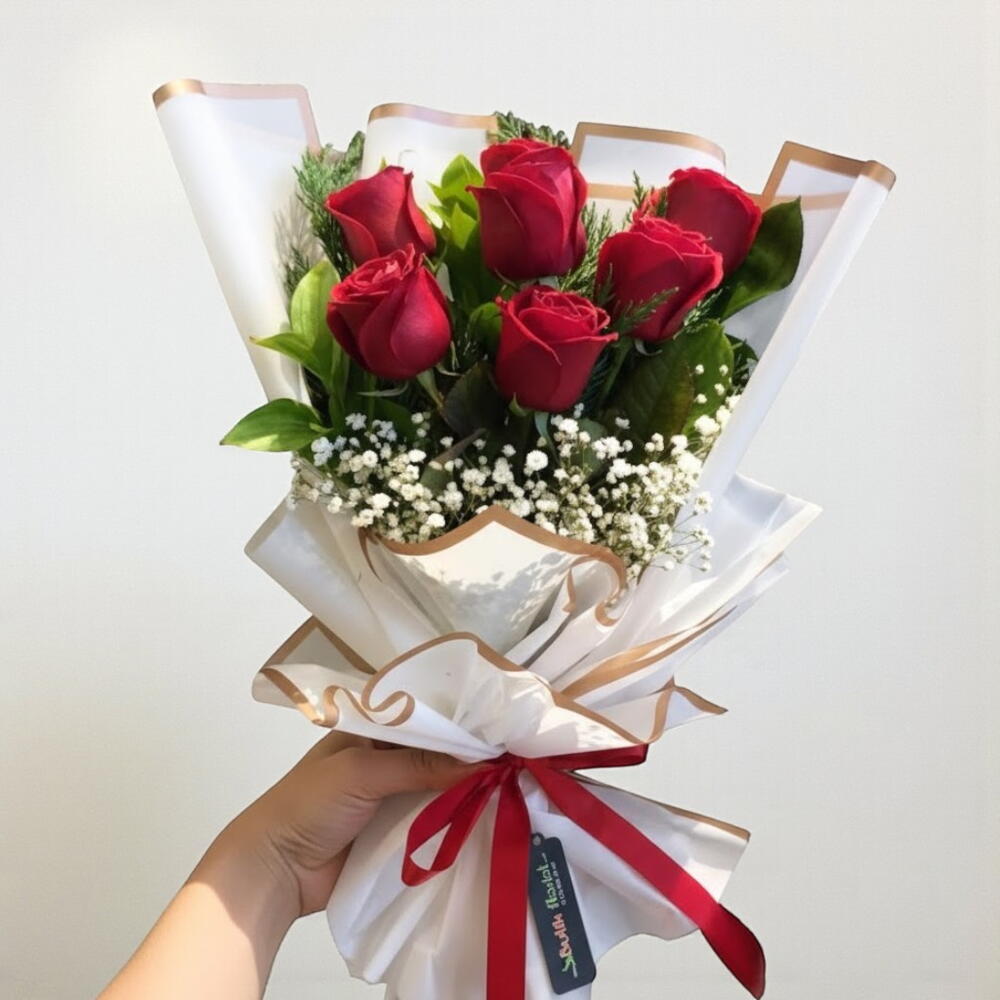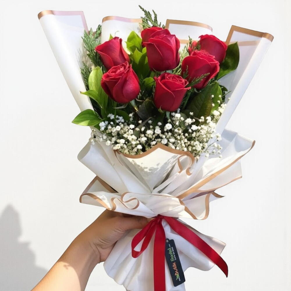 Bu zarif kırmızı gül buketi, romantizmin en klasik ve en etkileyici hâlini sunuyor. Canlı kırmızı güller, beyaz cipso bulutlarıyla yumuşatılarak hem şık hem de büyüleyici bir kontrast oluşturuyor. Altın detaylı beyaz ambalajı bukete modern ve asil bir görünüm kazandırırken, kırmızı kurdele tasarımı tamamlıyor. Sevdiklerinize duygularınızı sade ama etkileyici bir şekilde ifade etmek için ideal bir seçimdir. Buketin uzun ömürlü olması için serin ortamda saklamanızı, suya koyduğunuzda çiçeklerin alt yapraklarını temizlemenizi ve suyu her gün yenilemenizi tavsiye ederiz. Güllerin saplarını iki günde bir yeniden çapraz keserek tazeliklerini daha uzun süre koruyabilirsiniz.