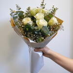 Zarafetin sade hali 🌼 Krem tonlarındaki güllerin asaleti, okaliptus yapraklarının yeşil tazeliğiyle buluşarak doğal bir uyum yaratıyor. Altın detaylı beyaz ambalajı ise bu zarif bukete modern bir dokunuş katıyor. Şıklığıyla her özel ana eşlik edecek, sade ama etkileyici bir hediye alternatifi. Buketinizin uzun ömürlü olması için her gün sap uçlarını çapraz şekilde kesin ve temiz suya yerleştirin. Serin ve gölge bir ortamda muhafaza edin.