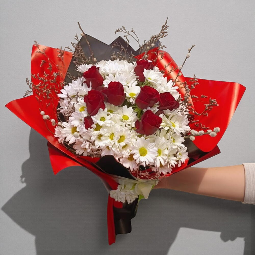 Tutkunun ve zarafetin çarpıcı birleşimi 🌹🌼 Kırmızı güllerin derin anlamı, beyaz papatyaların saflığıyla buluşuyor. Bu etkileyici kontrast, siyah ve kırmızı ambalajın modern çizgileriyle tamamlanarak özel günlerde sevginizi ifade etmenin en şık yoluna dönüşüyor. Aşk, teşekkür veya kutlama için unutulmaz bir hediye seçeneği. Çiçeklerinizi serin bir ortamda saklayın, her 2 günde bir suyu değiştirin. Sap uçlarını 2 cm kadar çapraz kesin. Direkt güneş ışığından uzak tutun.