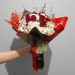 kırmızı gül - 7 adet kuru çiçek - 15 adet beyaz papatya - 20 adet