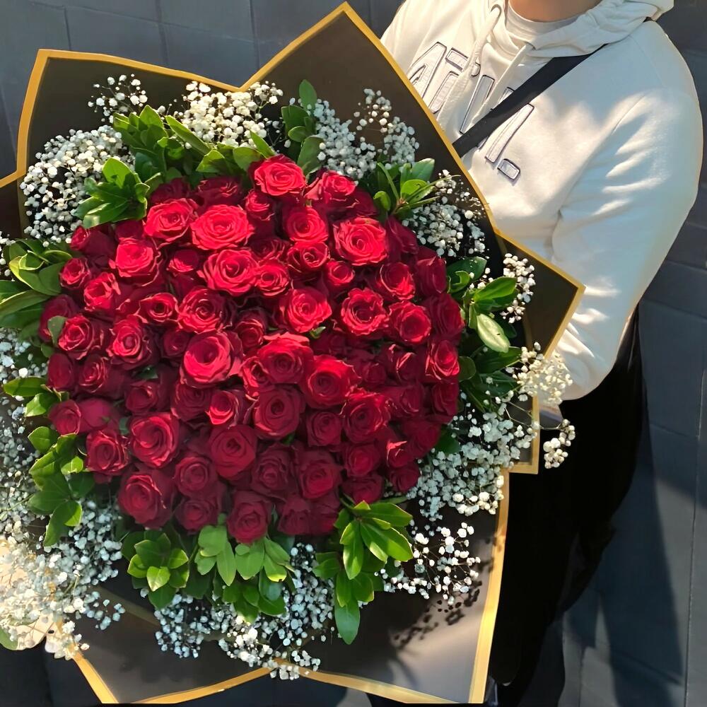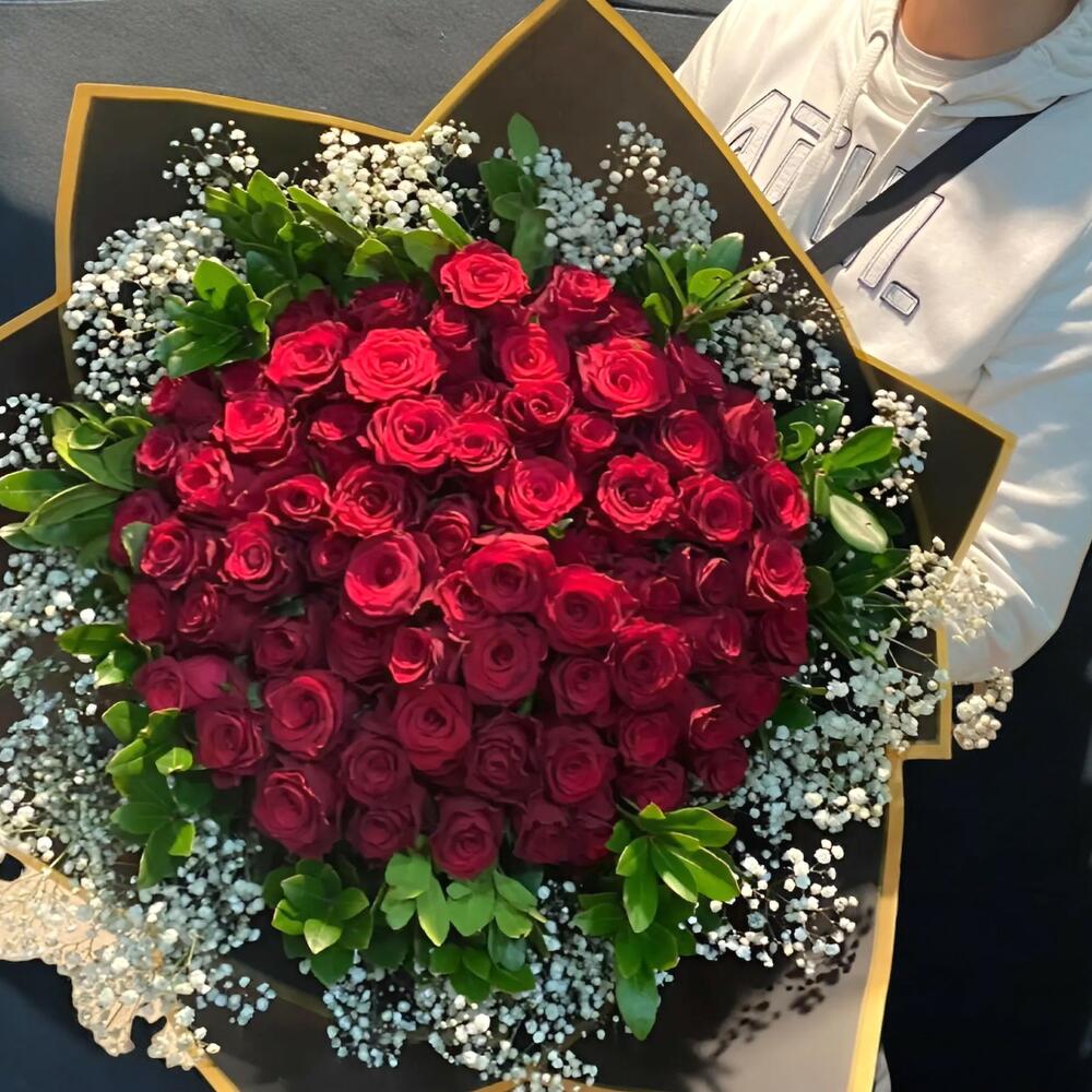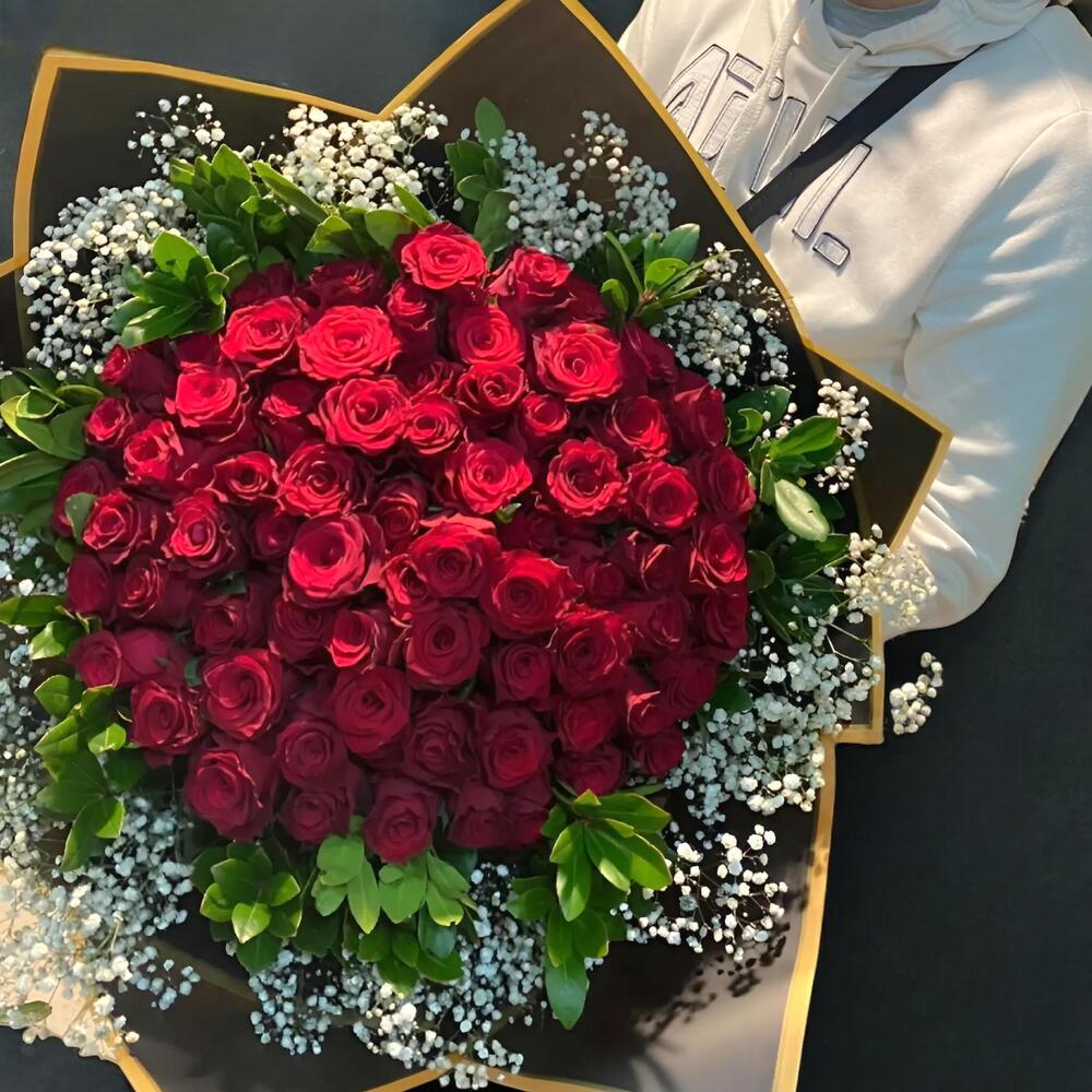 Aşkın, tutkunun ve sonsuz bağlılığın en etkileyici sembolü 71 adet kırmızı gül, beyaz cipsofilyalar ve zarif ruskus yapraklarıyla tamamlanarak muhteşem bir buket haline geldi. Özel anlarınıza şıklık ve zarafet katmak için mükemmel bir seçim!