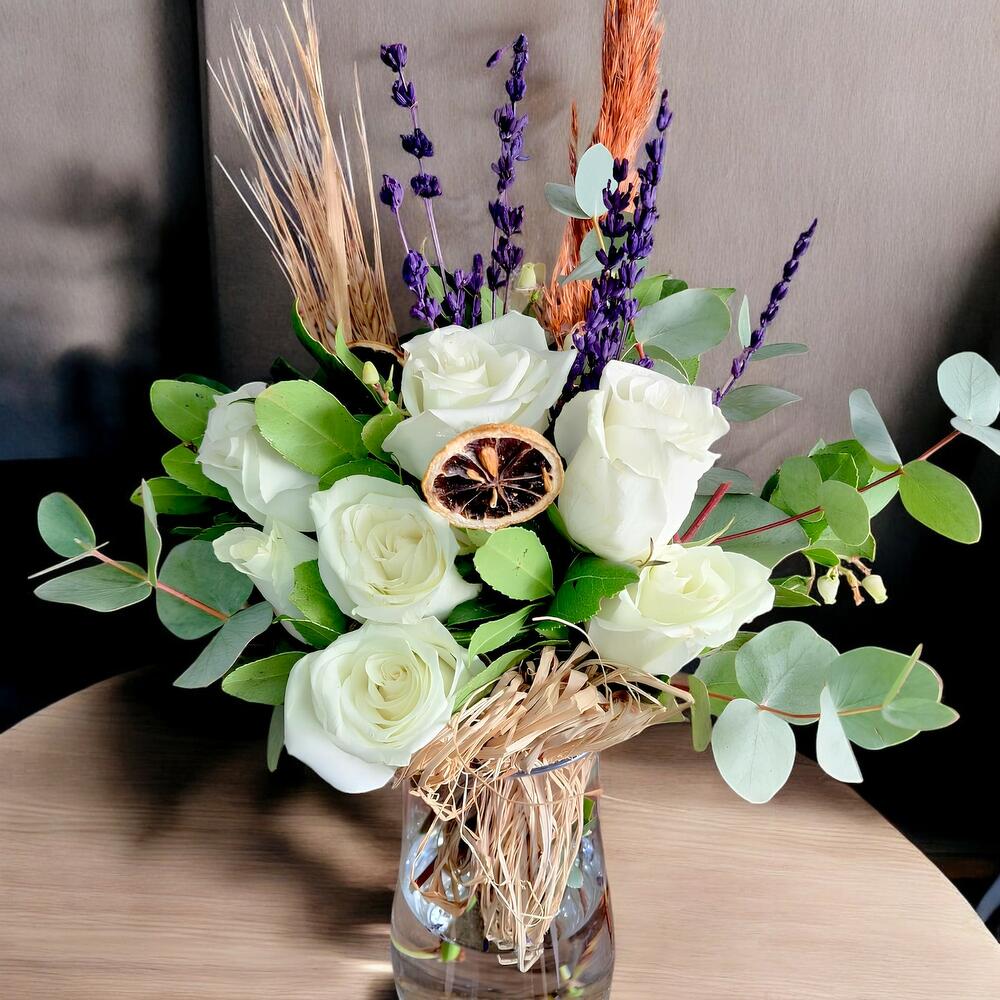 Bu özel tasarım ürün, 7 beyaz gül, 5 kuru limon, 15 dal kurucicek başak ve 1 adet şık cam vazo ile hazırlanmıştır. Beyaz güllerin saflığını ve zarafetini simgeleyen bu tasarım, her ortamda sofistike bir dokunuş sağlar. Kuru limonlar ise taze bir esinti katarken, kurucicek başakları doğal bir his verir. Bu ürün, evinize veya ofisinize modern ve taze bir görünüm getirecek.