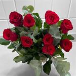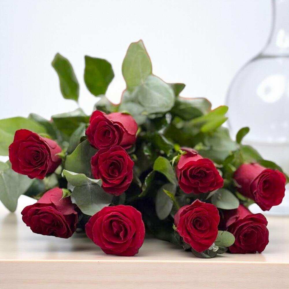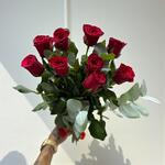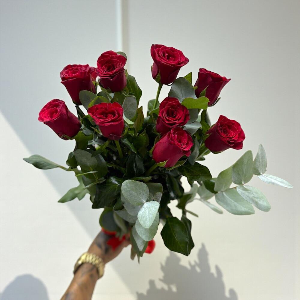 KIRMIZI TUTKU BUKETİ – 9 ADET İTALYAN GÜL VE OKALİPTÜS DALLARI