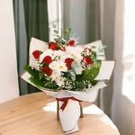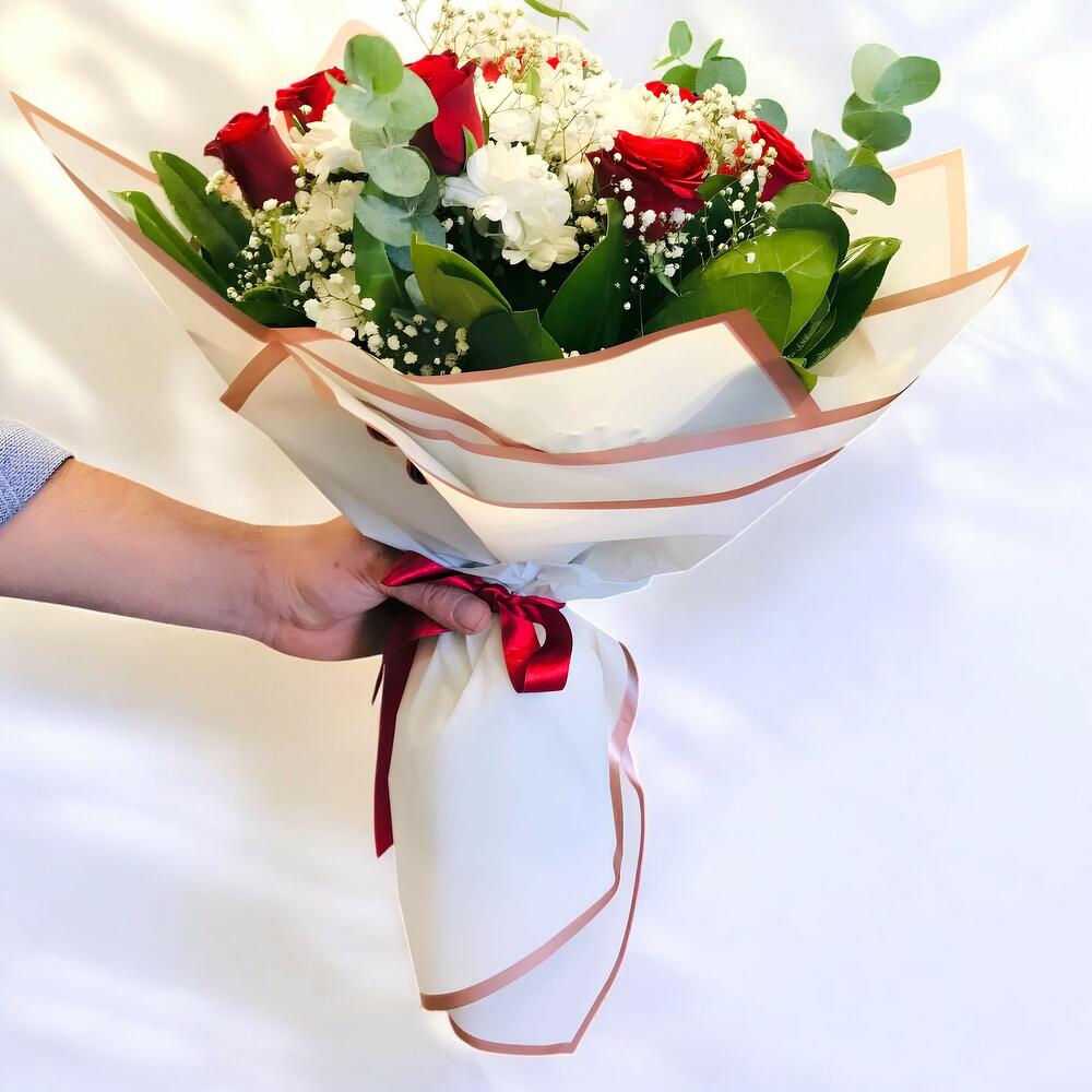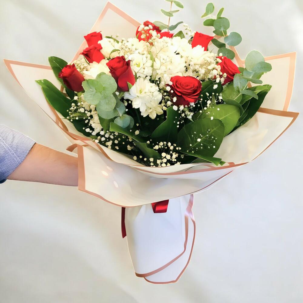 Bu muhteşem çiçek buketi, 9 adet güzide gül ve 1 adet beyaz papatya ile hazırlanmıştır. Düşünüldüğünde kalbinizi ısıtacak bir hediye olan bu buket, sevdiklerinizi gülümsetmek için mükemmel bir seçenektir. Zarif ve çarpıcı beyaz papatyası, büyüleyici kırmızı güllerle karıştırıldığında, mükemmel bir kontrast ve mükemmel bir uyum sağlar. Çarpıcı çiçek kombinasyonu, tüm özel anlarınızı ve kutlamalarınızı anlamlı kılar.