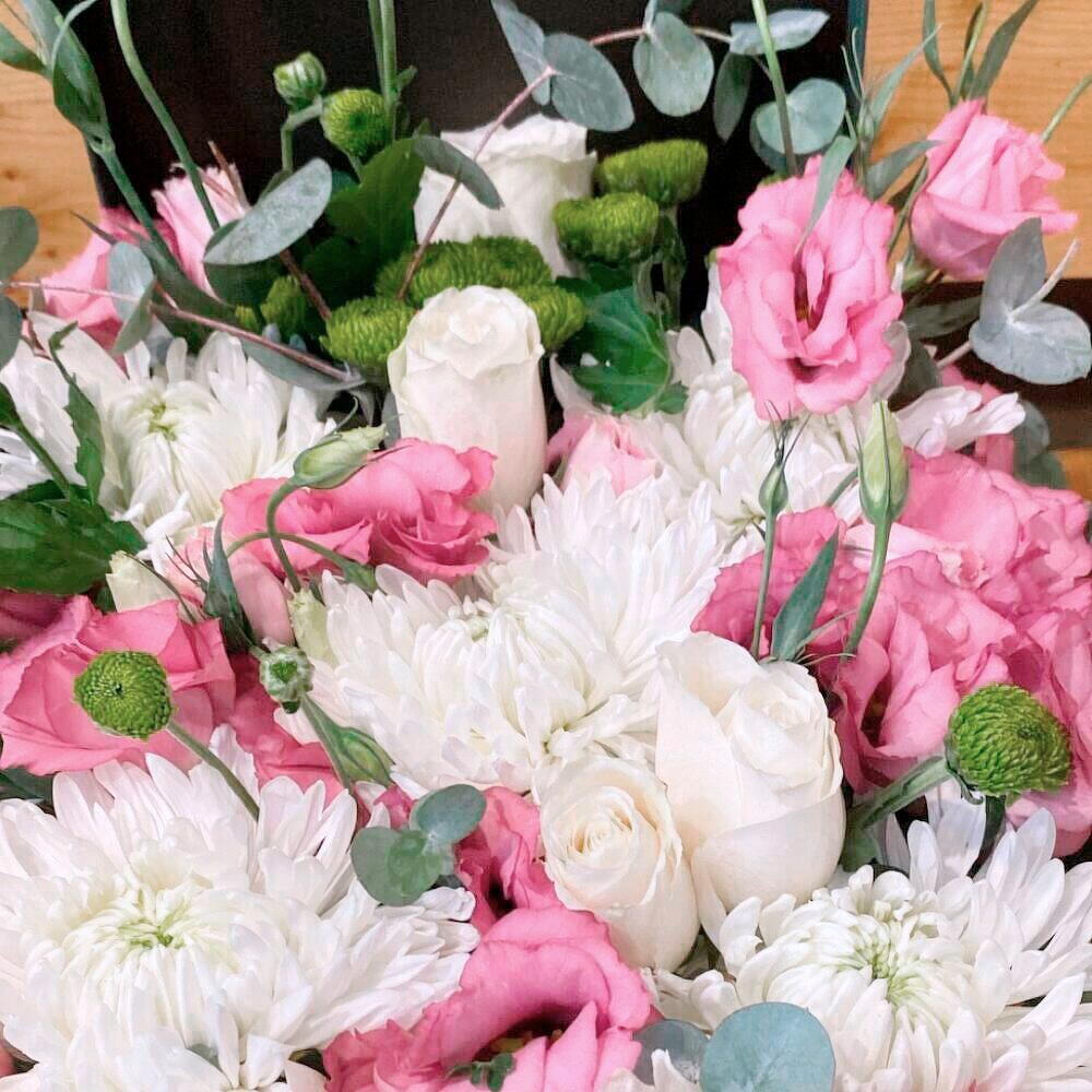 White rose - 7 adet okaliptüs - 10 adet chrysanthemum green - 8 adet lisyanthus pink - 10 adet anastasia white - 5 adet