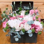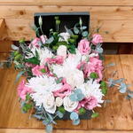 Bu zarif çiçek kutusu, romantik beyaz güllerin, pastel tonlardaki pembe lisyantusların ve canlı krizantemlerin büyüleyici uyumuyla özel anlarınıza anlam katıyor. Çiçeklerin tazeliğini ve canlılığını uzun süre korumak için, serin bir ortamda saklanmalı ve süngeri düzenli olarak nemli tutulmalıdır. Direkt güneş ışığından kaçınılması ve haftada birkaç kez hafifçe sulanması önerilir. Romantik ve zarif dokusuyla bu çiçek kutusu, sevdiklerinizin yüzünde unutulmaz bir gülümseme yaratacaktır.