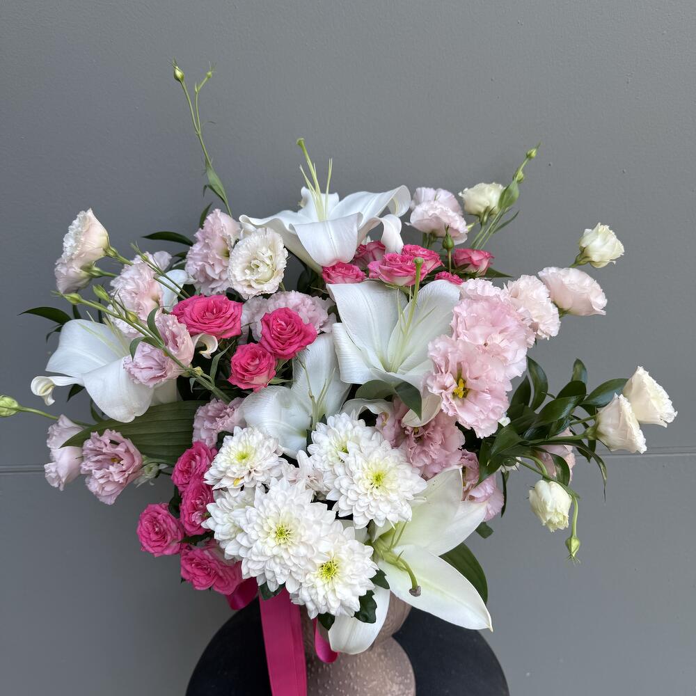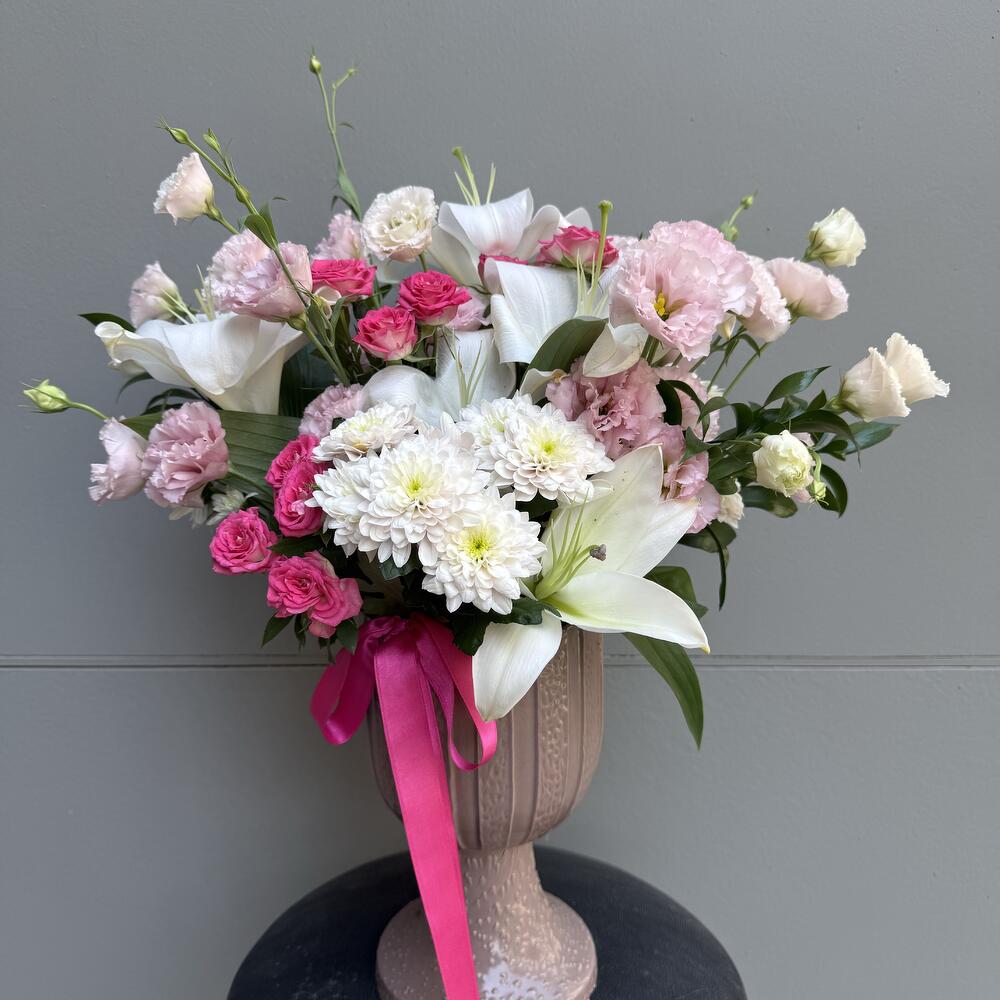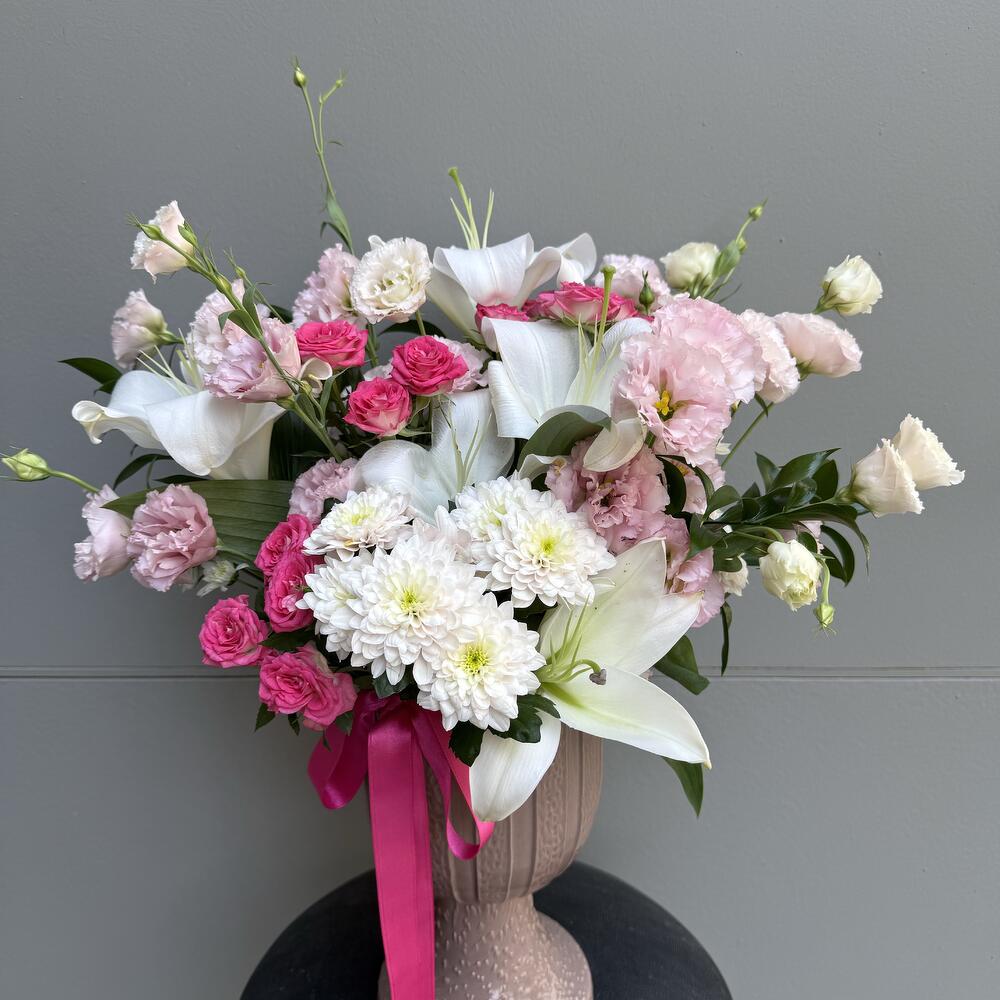 casablanca - 5 adet krizantem - 2 adet lusianthus - 15 adet çardak gül pembe - 3 adet