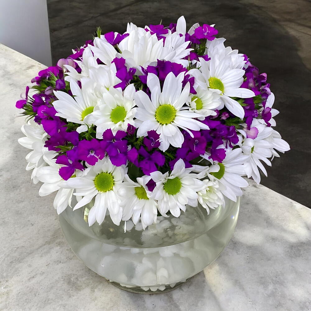 Bu şık ve canlı çiçek aranjmanı, her ortamı neşeyle dolduracak! Beyaz papatyalar ve mor menekşelerin muazzam uyumu, göz alıcı bir tasarım oluşturuyor. Saf beyazın ve canlı mor rengin birleşimi, zarif ve enerjik bir atmosfer yaratıyor. Şeffaf cam vazo içinde sunulan bu aranjman, her mekâna ferah bir hava katacak. Doğum günleri, Anneler Günü veya özel kutlamalar için mükemmel bir hediye alternatifi. Doğal ve sade yapısıyla her tür dekorasyona uyum sağlar. Bu çiçek aranjmanı, sevdiklerinize unutulmaz bir sürpriz yapmanın ideal yoludur!