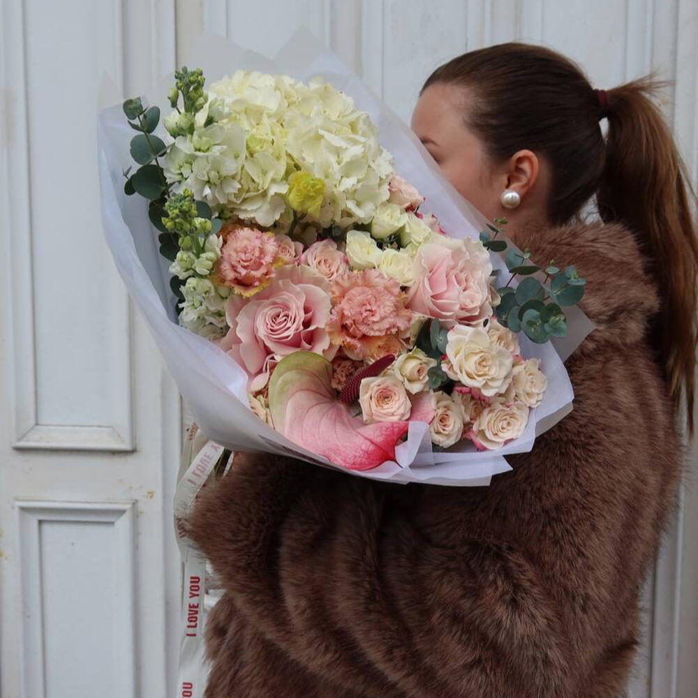 Eustoma - 2 adet Spray rose - 5 adet hortensia - 1 adet anturyum - 1 adet mattiola - 2 adet dıanthus - 1 adet dünya çapında güller - 2 adet okaliptüs - 1 adet boks - 1 adet