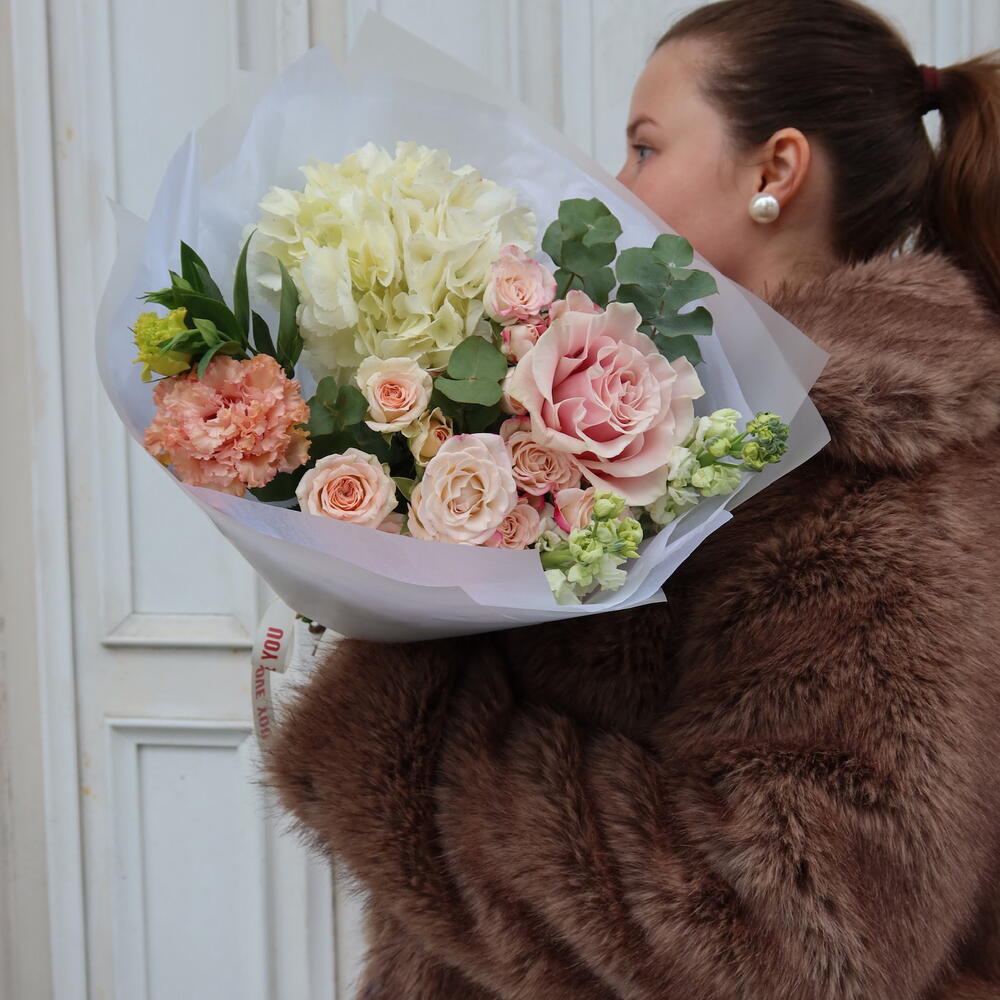 Eustoma - 1 adet Spray rose - 3 adet hortensia - 1 adet mattiola - 2 adet dünya çapında güller - 1 adet okaliptüs - 1 adet boks - 1 adet