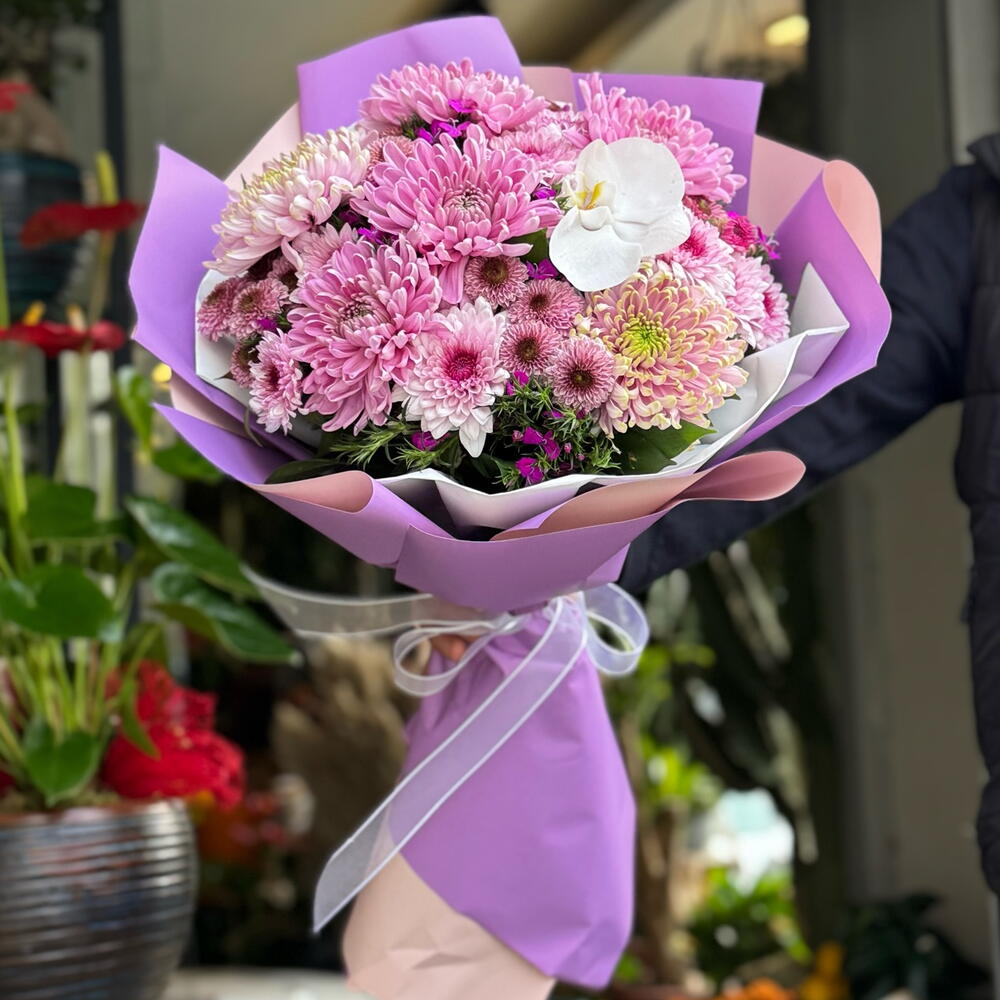 Pembe Ahenk Kasımpatı Buketi, yumuşak tonlarda pembe kasımpatılar ve zarif beyaz orkide detayıyla hazırlanan özel bir tasarımdır. Hem modern hem de romantik bir görünüm sunan bu buket; doğum günü, yıldönümü, teşekkür, geçmiş olsun veya sıradan bir günü güzelleştirmek için ideal bir seçimdir. Özenle seçilmiş taze çiçekler, mor ve pembe tonlarında şık ambalajıyla bir araya getirilerek zarif bir hediye formu oluşturur. Sevdiklerinize hem renk hem mutluluk katmak için mükemmel bir tercih.