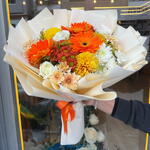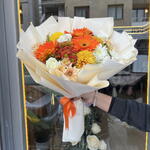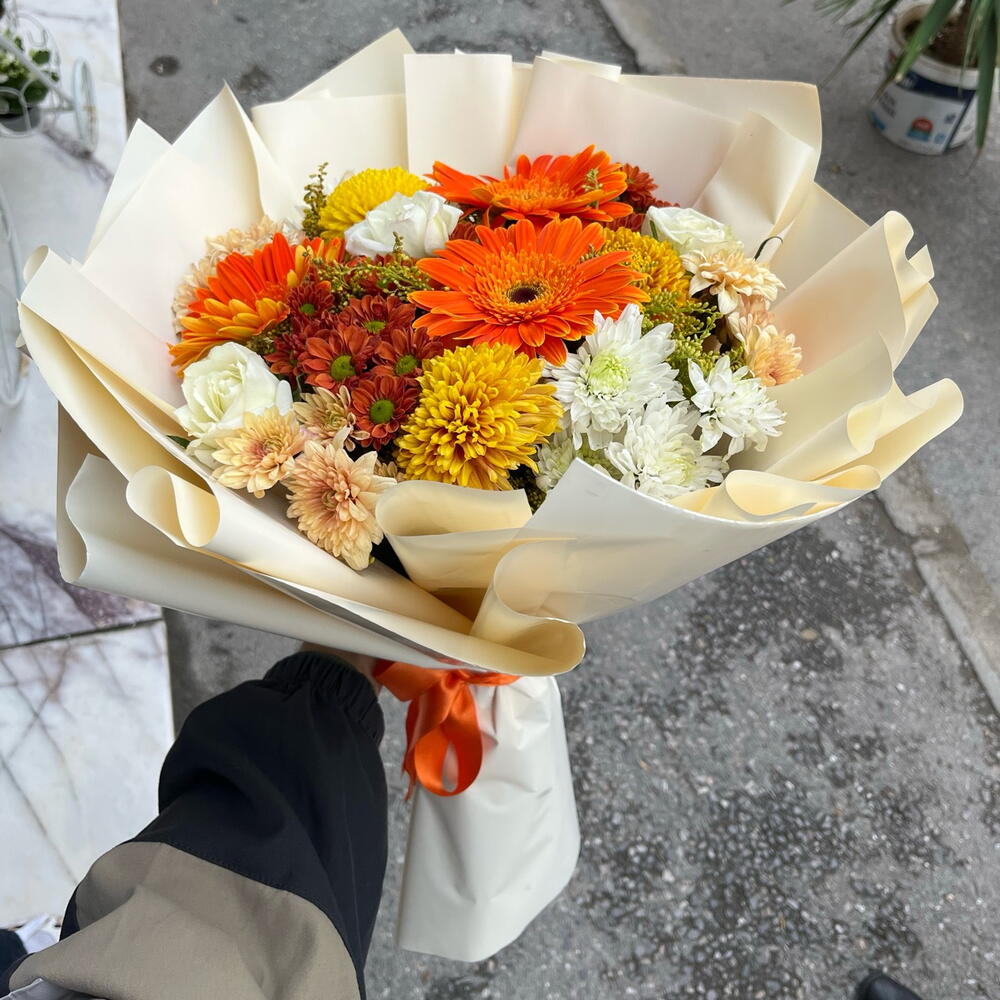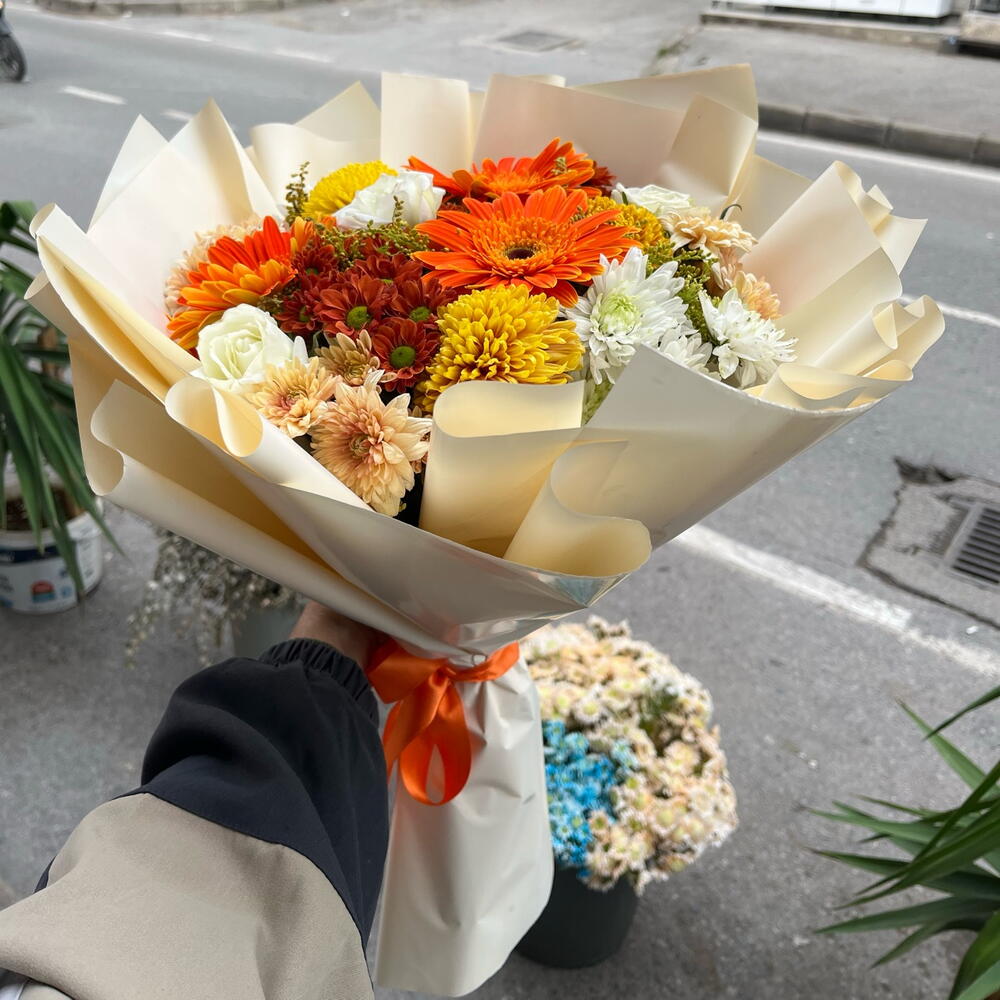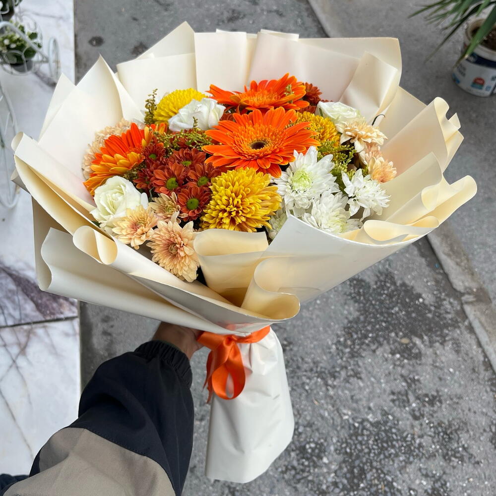 solidaster - 4 adet virgatus - 30 adet beyaz gül - 3 adet kasımpatı - 15 adet turuncu gerbera - 4 adet