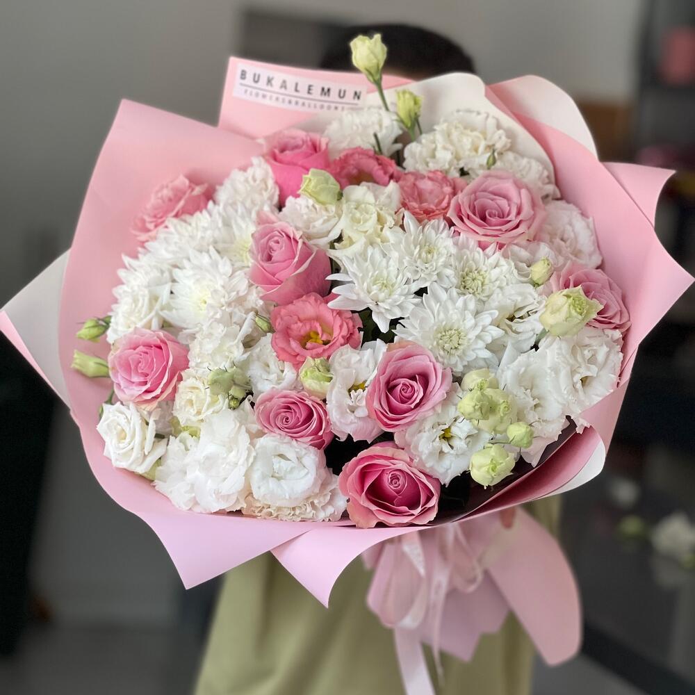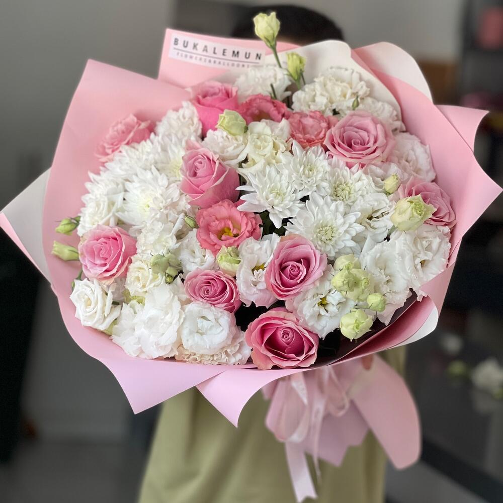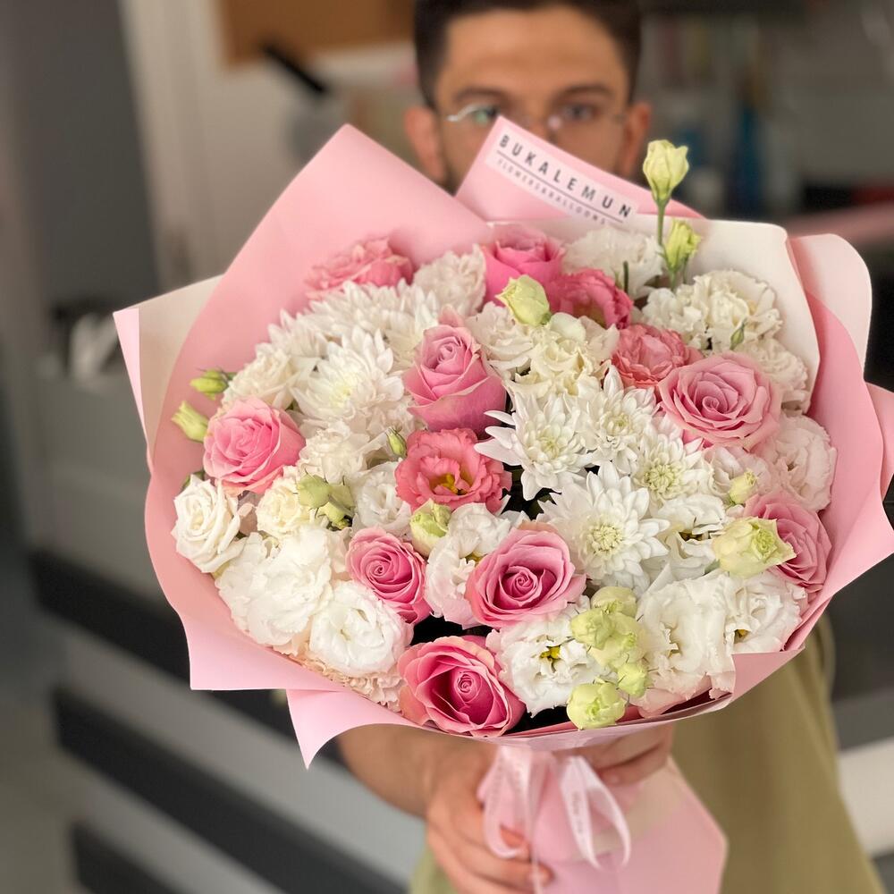 Bu zarif Karışık Buket, serin beyaz tonlarından oluşur ve mükemmel bir karışımı temsil eder. Buketimiz, her seferinde tazeliğini ve güzelliğini koruyan 21 adet Eustoma, 9 adet Rose ve 3 adet Krizantem içerir. Her çiçek özenle seçilmiştir ve buket, sevdiklerinize hediye etmek veya evinizde çarpıcı bir odak noktası oluşturmak için mükemmel bir seçimdir. Bu çiçekler, her mevsimde size bahçenin tazeliğini ve güzelliğini getirecektir.