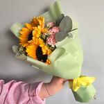tanacetum - 2 adet saten kurdele - 1 adet okaliptüs - 1 adet karanfil - 3 adet ayçiçeği - 2 adet tasarım ambalaj - 1 adet