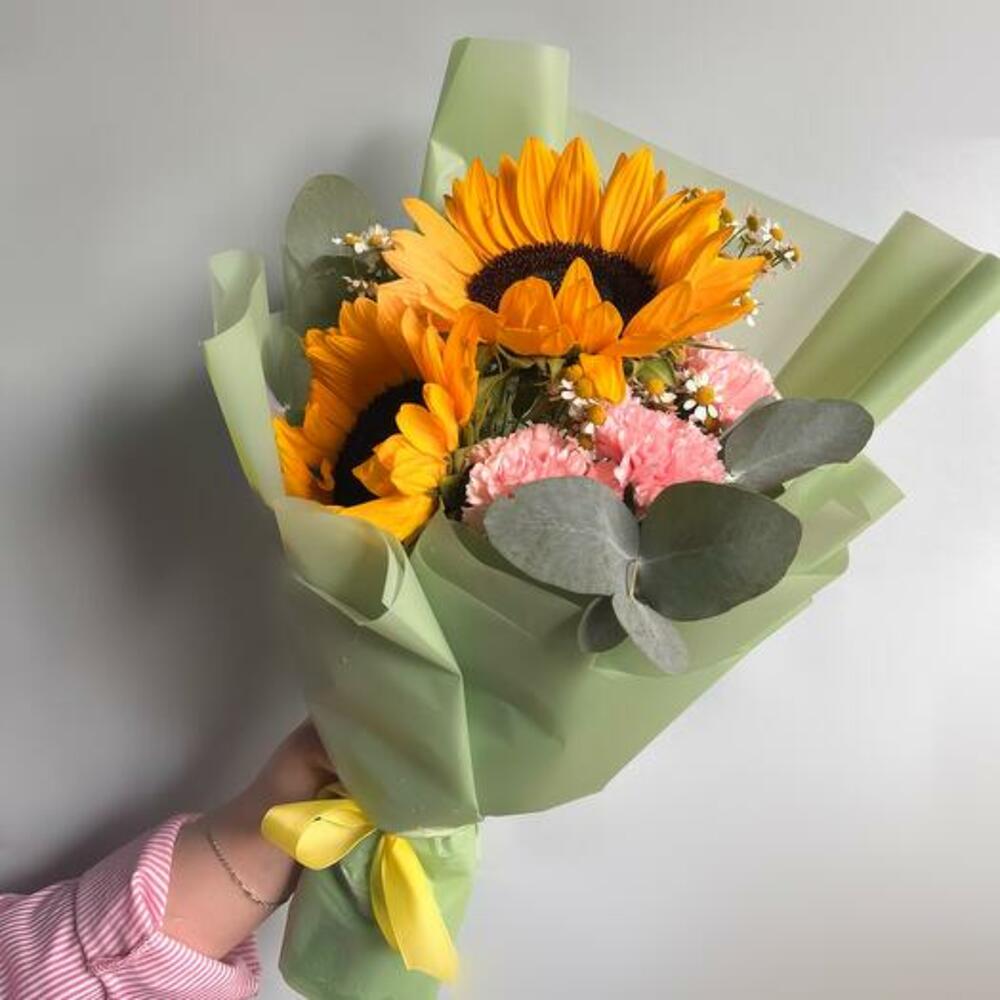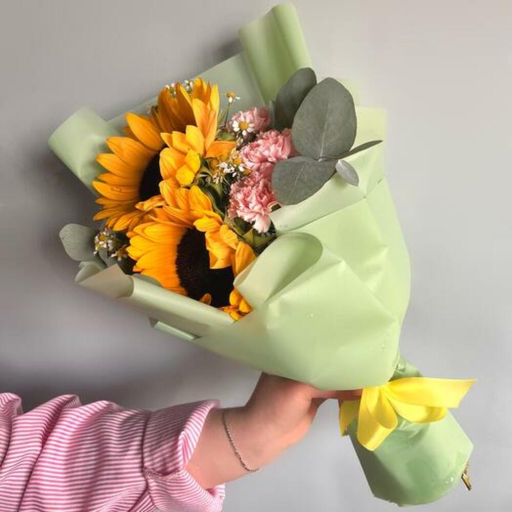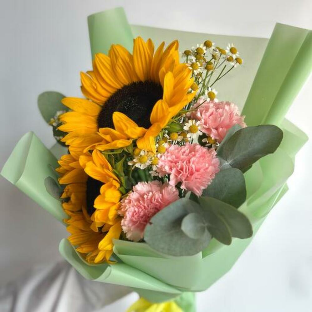 Buketimiz, şaşırtmak ve büyülemek için tasarlanmış, türünün tek örneği bir eserdir. Işıltılı ayçiçekleri, yumuşak pembe karanfiller ve neşeli papatyalar içeren bu buket, her durum için mükemmel bir tamamlayıcıdır. Renk ve dokuların eğlenceli karışımı, sıcaklık ve neşeyi çağrıştırarak birinin gününü aydınlatmak için ideal bir hediye olmasını sağlar. Sevgiyle el yapımı olarak hazırlanan bu buket, güzelce aranje edilmiş, gülümsemeler ve güneş ışığı sunmaya hazır bir şekilde gelir.