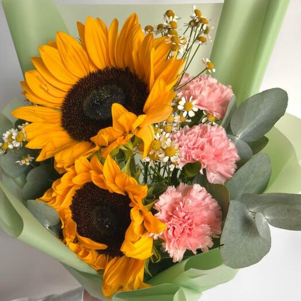 Ayçiçekleri, Pembe Karanfiller ve Papatyalar Buketi
