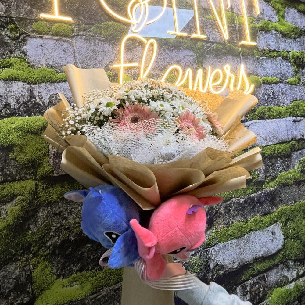 Bu büyüleyici çiçek buketi, 2 adet sevimli ayıcık, 7 adet canlı renkli Gerbera, 20 adet zarif beyaz papatya ve 10 adet cipso ile süslenmiştir. Tüm bu güzellikler, 5 parça kraft kağıda sarılır ve 2 zarif kurdele ile tamamlanır. Bu çiçek buketi, her tür özel anınızı kutlamak için mükemmel bir seçenektir.
