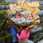 Gerbera - 7 adet kraft paper wrapping - 5 adet beyaz papatya - 20 adet cipso - 10 adet ayıcık - 2 adet kurdela - 2 adet