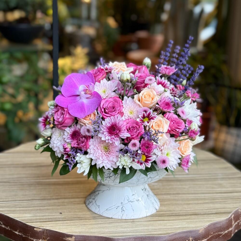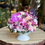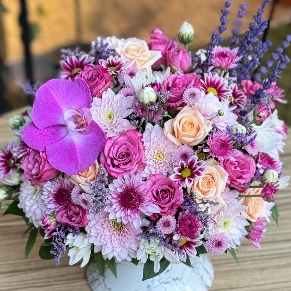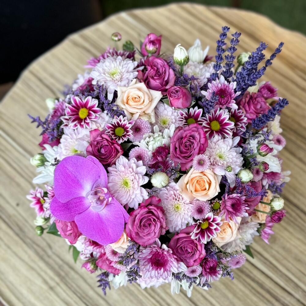 Bu muhteşem çiçek kasası zarif renkleri ve dikkat çekici detaylarıyla her ortamda dikkat çeker. İçerisinde 15 adet sprey gül, 10 adet kasımpatı, 1 adet orkide ve 20 adet lavanta bulunmaktadır. Her biri özenle seçilmiş ve bir araya getirilmiş bu çiçekler, çiçek kasasını sadece bir hediye olarak değil aynı zamanda bir dekorasyon öğesi olarak da kullanılabilir. Versatil ve şık bu çiçek kasası, herkesin beğenisini kazanacak.