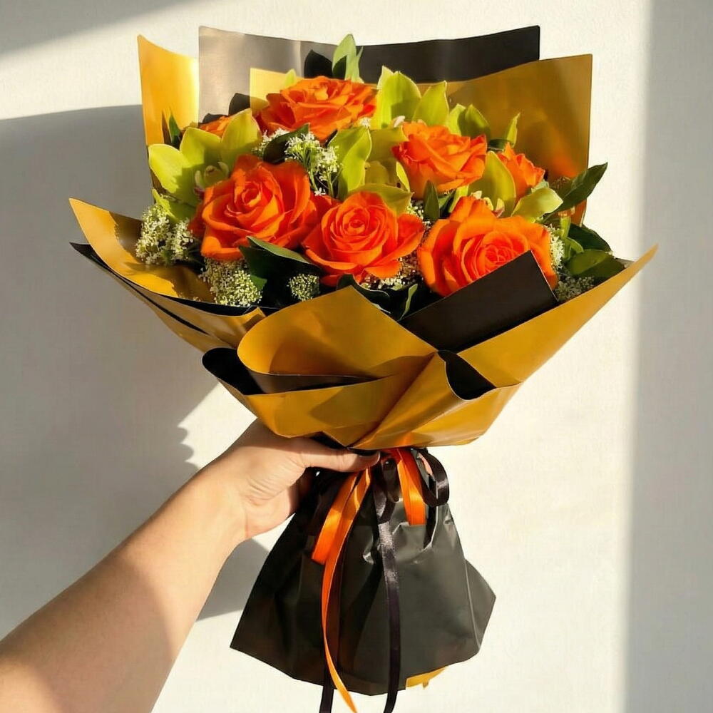 Basic Orange buketi, canlı turuncu güllerin ve zarif orkide çiçeklerinin mükemmel uyumunu yansıtan bir aranjmandır. İçeriğinde 7 adet ithal turuncu gül ve 4 adet orkide yer almaktadır. Turuncu güllerin enerjik ve sıcak tonları, orkide çiçeklerinin zarafeti ile birleşerek etkileyici bir tasarım oluşturur. Bu özel tasarım, her ortamda dikkat çekecek ve zarif bir hava yaratacaktır. Buket, şık siyah ve altın sarısı kağıtlarla sarılmış olup, şıklığını tamamlayan turuncu ve siyah kurdele ile bağlanmıştır. Hem özel günlerde hem de günlük dekorasyon için mükemmel bir tercih olacaktır. Bakım Önerileri: İthal güllerin ve orkide çiçeklerinin uzun süre taze kalabilmesi için, doğrudan güneş ışığından uzak bir yerde tutulması önemlidir. Çiçeklerinizi düzenli olarak sulayın, ancak fazla su vermemeye dikkat edin. Saksıdaki su seviyesini kontrol ederek çiçeklerin sağlıklı kalmasını sağlayabilirsiniz. Bu aranjman, doğru bakım ile uzun süre taze ve canlı kalacaktır.