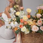 Bu muhteşem sepet, ilkbaharın güzelliğini yansıtan büyüleyici bir şeftali-sarı-pembe uyumuyla doludur. Şakayık güller, zarif ve gösterişli şekilde açarak güzellik ve zarafetin bir simgesi gibi parıldar. Hor çiçeği dalları, yeşil yaprakların arasından süzülen güneş ışıkları gibi parlak bir dokunuş katar. Ortancalar ve çalı gülleri, bu aranjmanı daha fazla incelik ve zarafet kazandırır. Orkideler, karanfiller ve fındık dalları ise bu güzel kompozisyonu tamamlayarak narinlik ve şıklığın muhteşem bir izlenimini sunar.