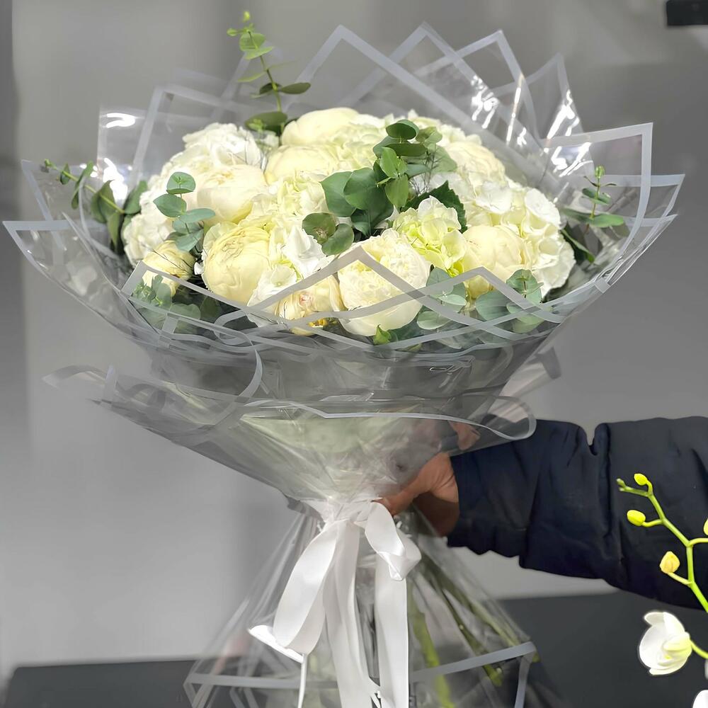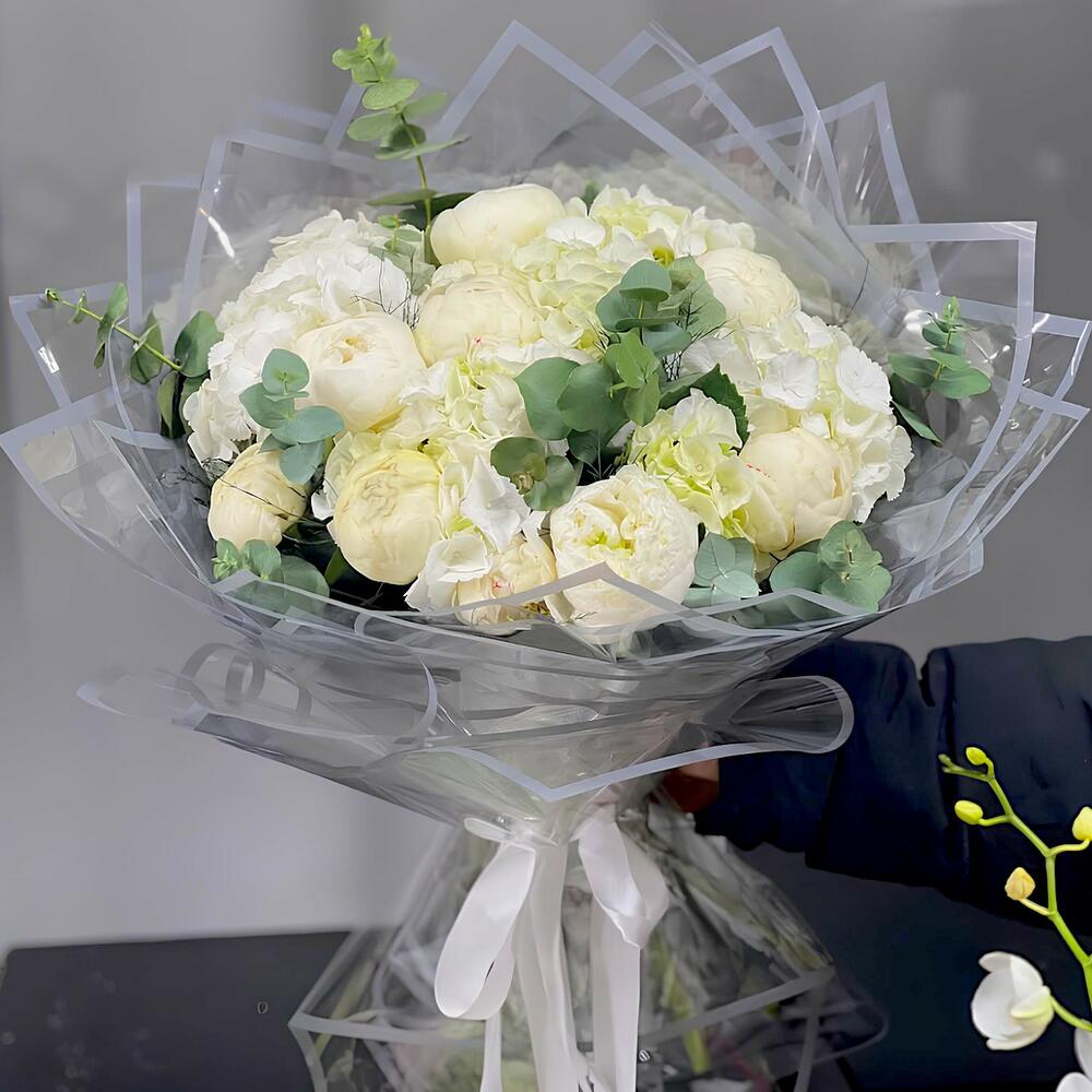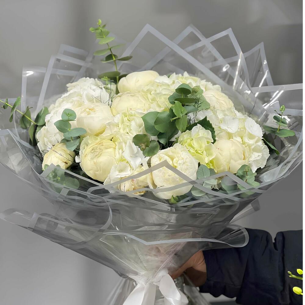 Zarif beyaz şakayıklar ve ortancalar ile oluşturulan bu özel buket, sadeliğin ve zarafetin en güzel temsilidir. Şeffaf ambalajı ve zarif kurdelesiyle göz alıcı bir tasarıma sahiptir. Sevdiklerinize özel günlerde veya içten bir teşekkür için sunabileceğiniz sofistike bir çiçek aranjmanıdır.