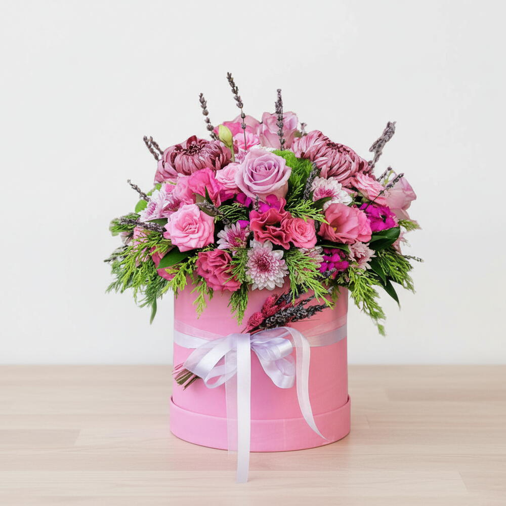 pembe gül - 5 adet okaliptus - 3 adet lila gül - 5 adet lavanta - 6 adet pembe kutu - 1 adet anastasya - 2 adet greentreek - 4 adet