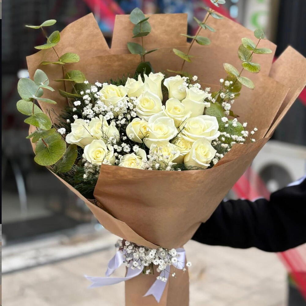okaliptüs - 7 adet beyaz gül - 17 adet cipsofilya çiçeği - 7 adet ambalaj - 4 adet