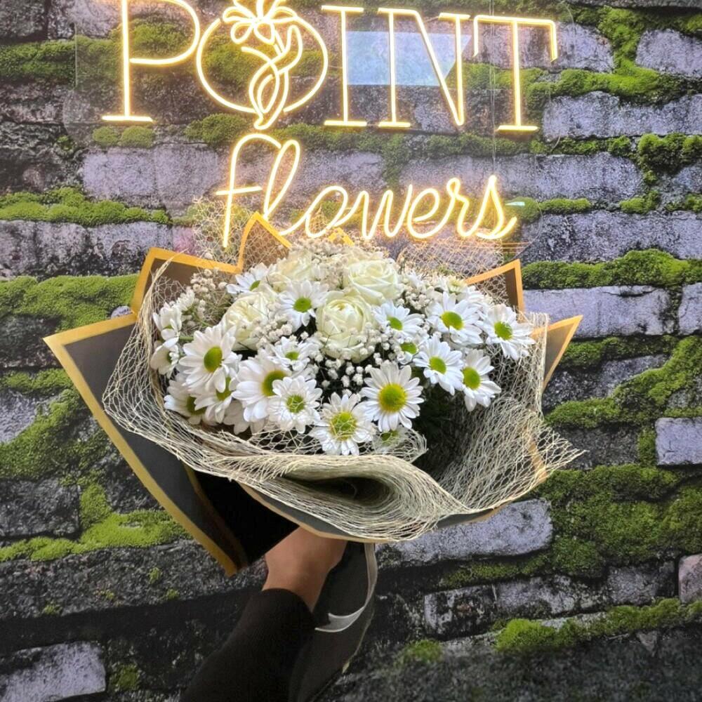 Başlık: Saflığın ve Zarafetin Buluşması Açıklama: Beyaz papatyaların masumiyeti, beyaz güllerin zarafeti ve cipso çiçeklerinin narin dokunuşuyla hazırlanan bu özel buket, kül rengi sargısıyla şıklığını tamamlıyor. Sevdiklerinize saf duygularınızı ifade etmenin en zarif yolu.