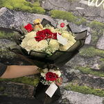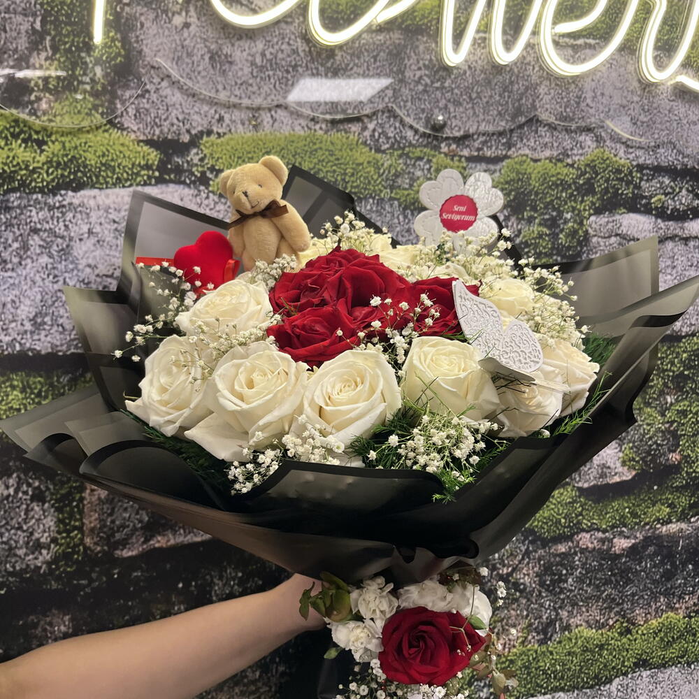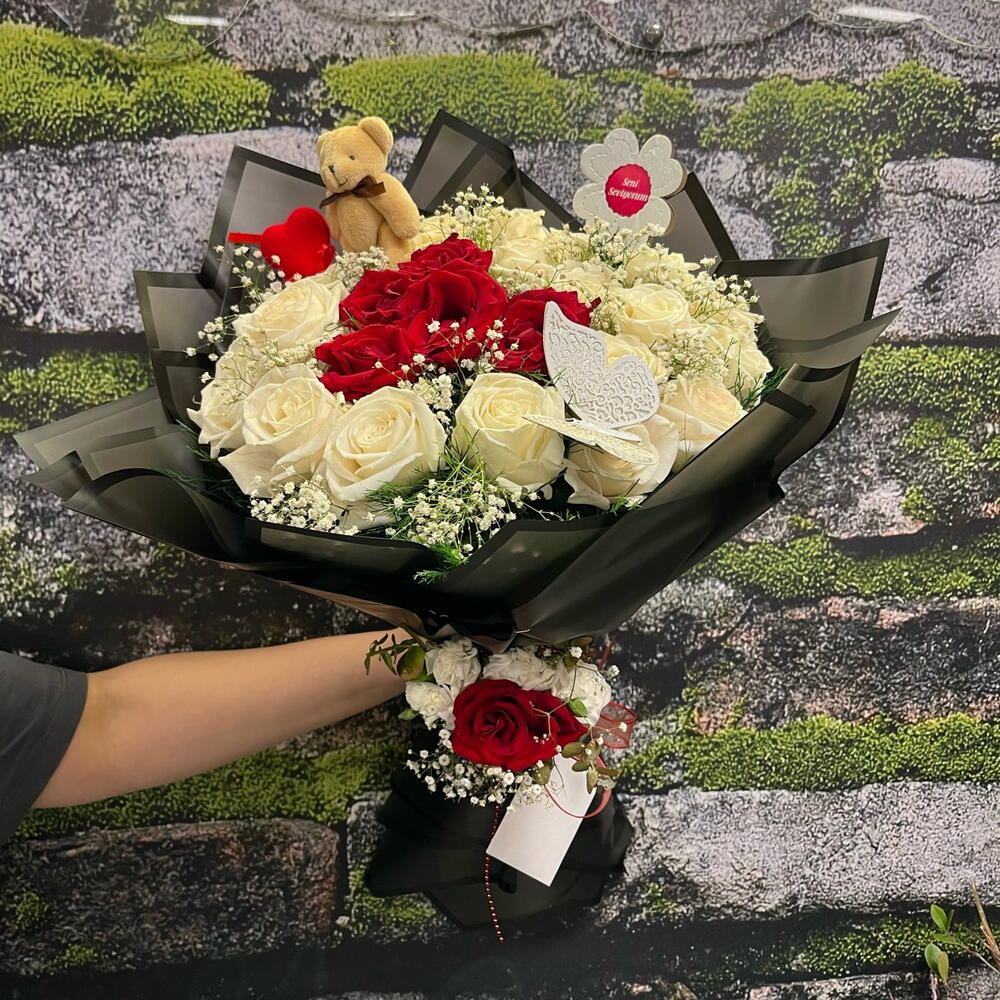 kırmızı gül - 5 adet beyaz gül - 20 adet cipso - 30 adet kalp çubuk - 1 adet ayıcık - 1 adet kelebek - 1 adet seni seviyorum - 1 adet