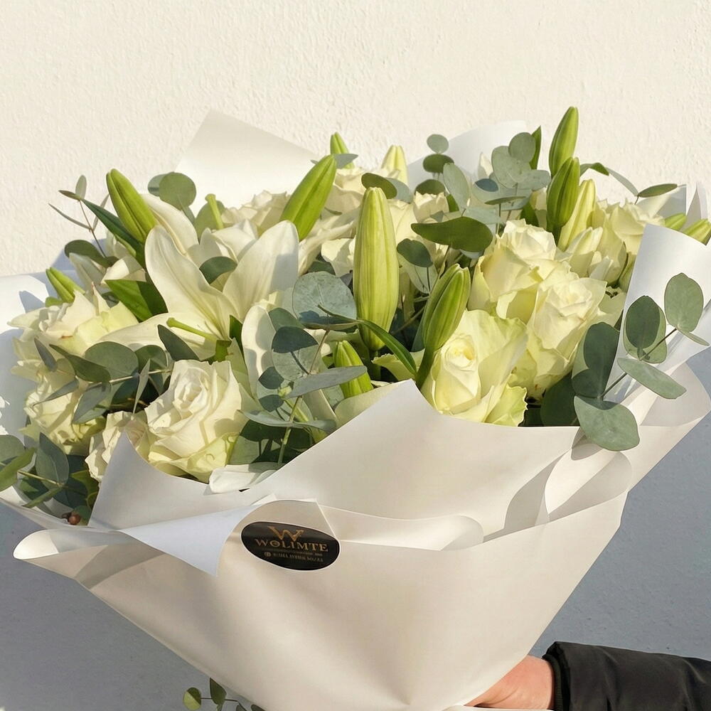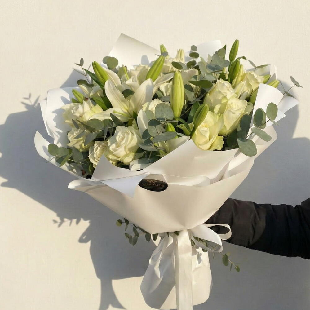 Bu zarif çiçek buketi, 15 adet beyaz gül, 5 adet beyaz lilyum ve 20 dal taze okaliptüsün mükemmel uyumuyla bezenmiştir. Her birini özenle seçtik ve jelatinle süsledik. Son olarak, şıklığını tamamlamak için 2 adet saten kurdeleyle bağladık. Bu buket, sevdiklerinize ne kadar önemli olduklarını ifade etmenin en güzel yolu olacaktır.