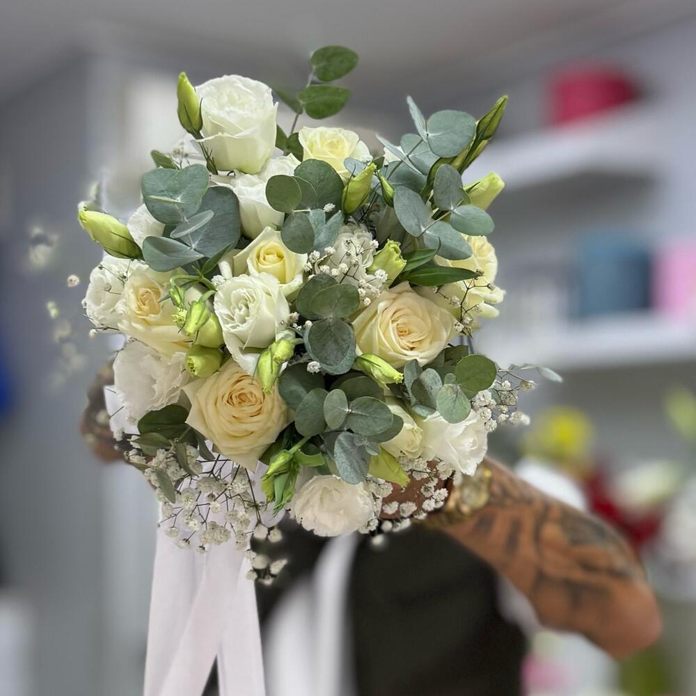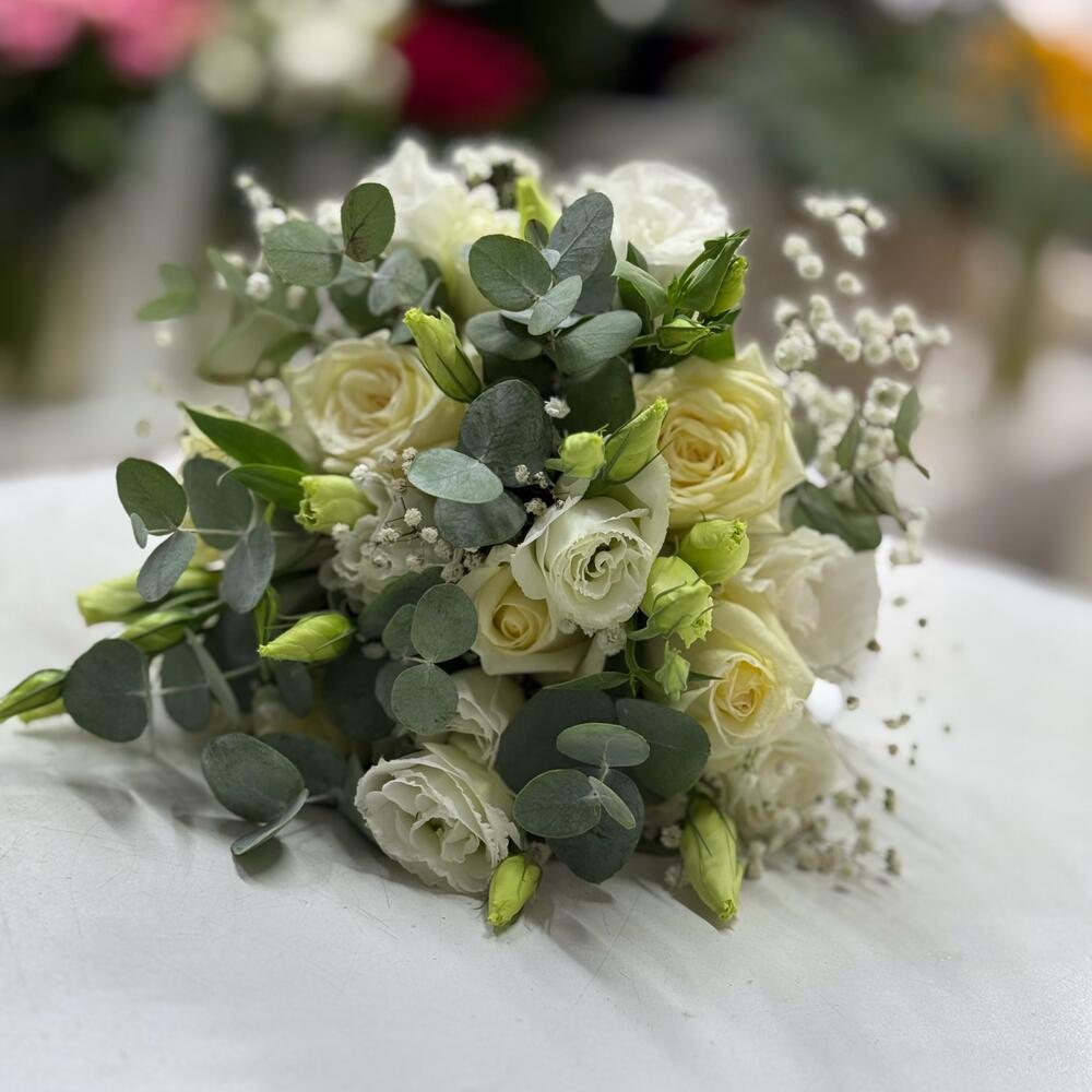 gipsofila - 5 adet okaliptüs - 10 adet beyaz gül - 10 adet beyaz lisyantus - 10 adet