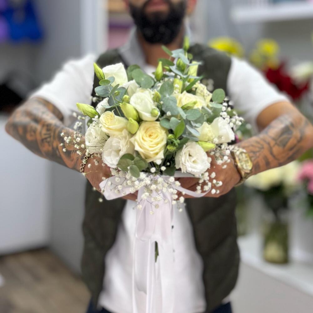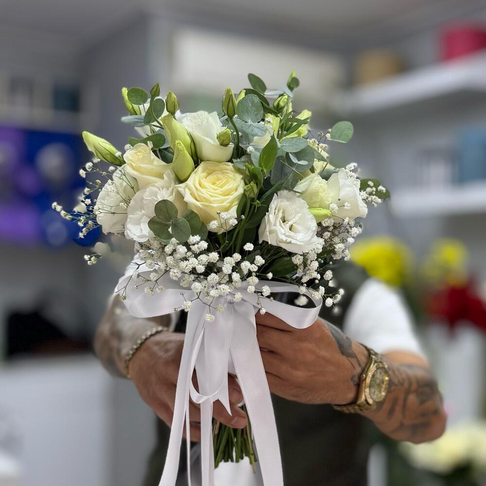 Beyaz gul lisyantus gelin buketi