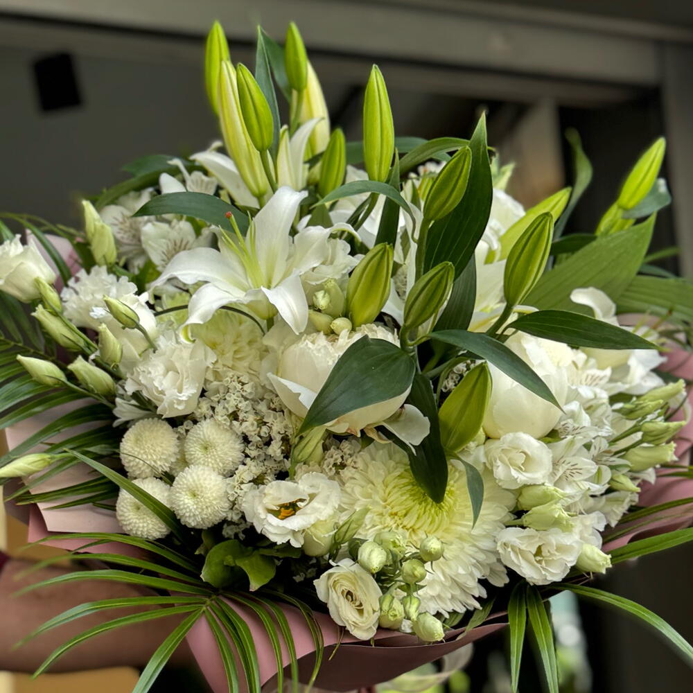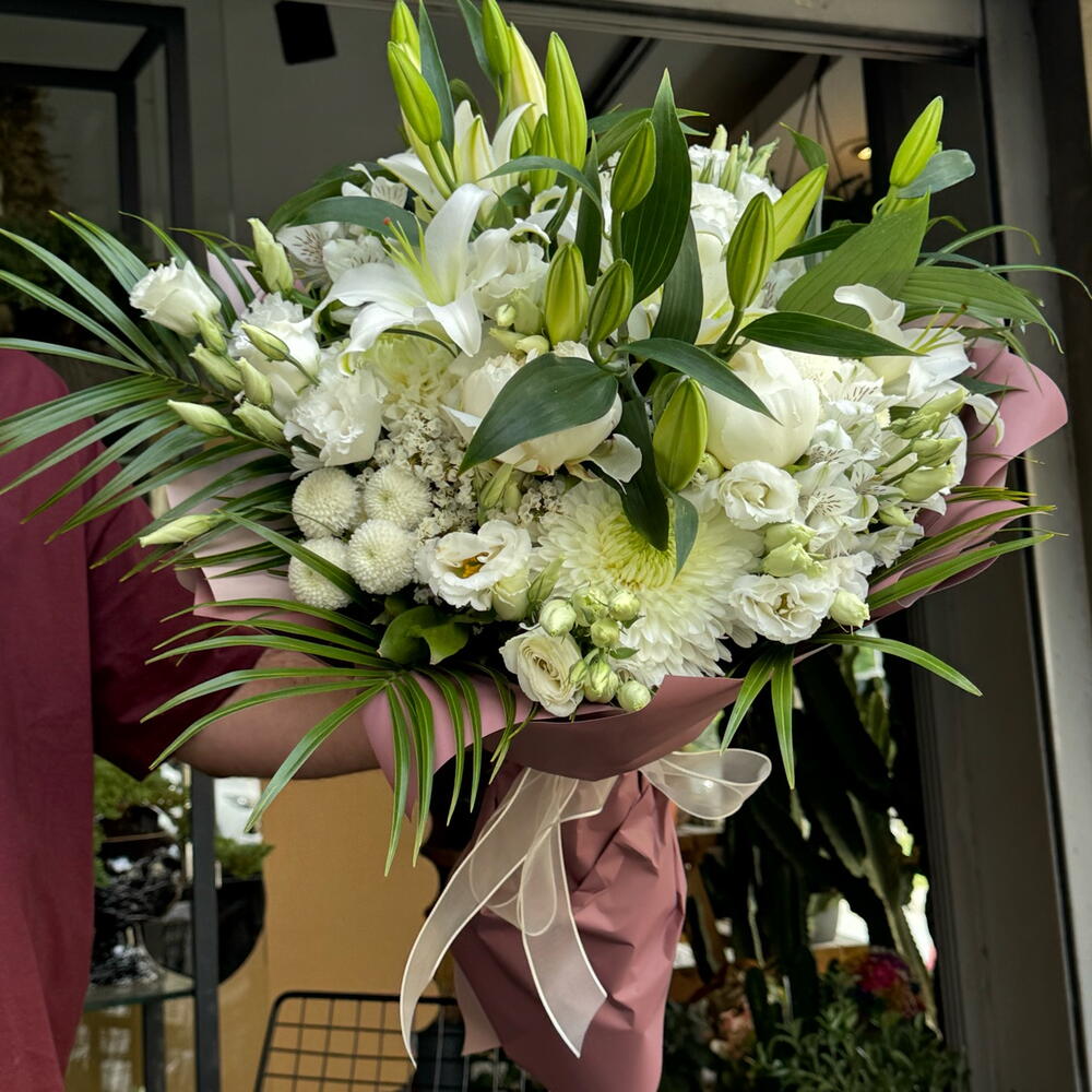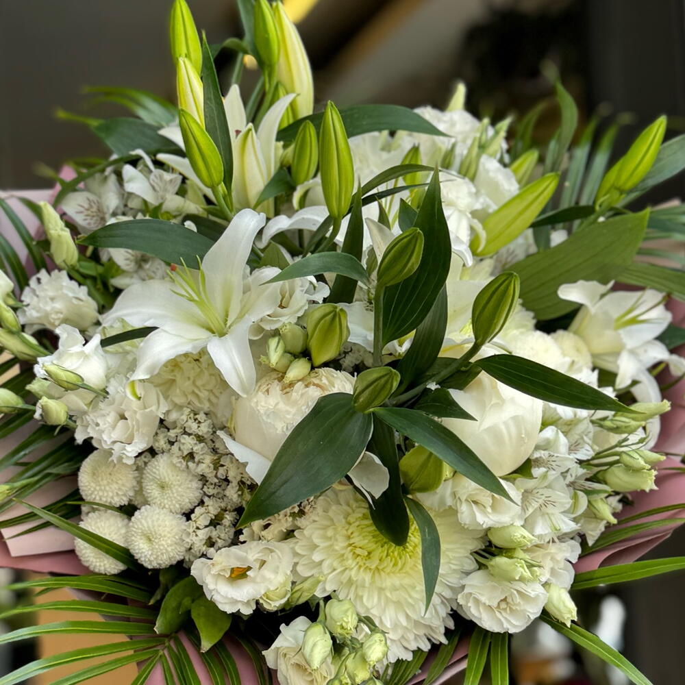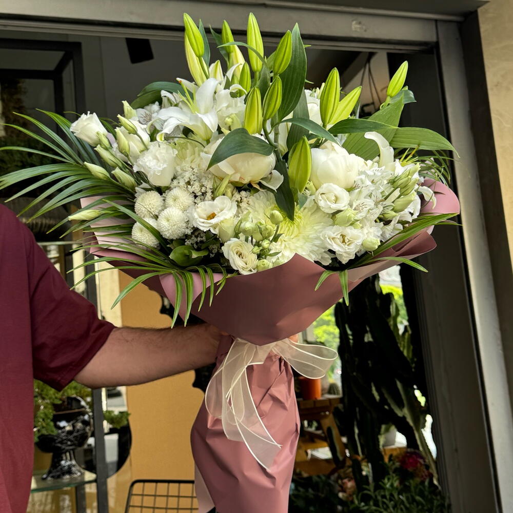 “Beyazın Saf Zarafeti” Saflığın ve huzurun en güzel yansıması olan bu özel buket; beyaz lilyumlar, şakayıklar, gül ve krizantem gibi zarif çiçeklerle özenle hazırlanmıştır. Şık pembe ambalajı ve beyaz kurdelesiyle hem sade hem de etkileyici bir duruş sergiler. Sevdiklerinize taze, doğal ve şık bir hediye vermek isterseniz bu buket tam size göre. Özellikle taziye, düğün, doğum ya da anlamlı bir “seni düşünüyorum” hediyesi olarak tercih edilebilir.