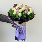 Pastel tonların zarafetini öne çıkaran bu buket; krem ve lila güllerin yumuşak geçişli renk uyumuyla romantik ve sakin bir atmosfer yaratır. Yoğun, sağlıklı yeşillikler buketin hacmini dengelerken; mor ve siyah ambalajın modern kontrastı tasarımı daha da sofistike bir görünüme kavuşturur. Doğal rafya detayları ise bukete sıcak ve doğal bir dokunuş ekler. Hem hediye olarak hem de özel gün dekorasyonlarında tercih edilebilecek, şık ve duygulu bir aranjmandır. Buketin canlılığını koruması için serin bir ortamda tutulması, sapların tazelenmesi ve temiz su kullanılması tavsiye edilir.