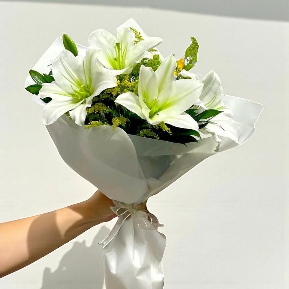 Bu zarif beyaz lilyum buketi, saflığın ve masumiyetin mükemmel bir temsilidir. Buket, 4 adet beyaz lilyumun asaletini, 4 adet solidaster çiçeğinin neşesini ve 7 adet Ruscus bitkisinin canlı yeşilliğini bir araya getiriyor. Özel günlerde veya sevdiklerinize anlamlı bir hediye olarak sunmak için harika bir seçimdir. Tavsiye: Çiçeklerin tazeliğini korumak için buketi serin bir ortamda muhafaza ediniz ve suyu her gün değiştiriniz. Lilyumların yaprakları ve sapları, temiz suyla temas ettiğinde daha uzun süre canlı kalır. Doğrudan güneş ışığından uzak tutarak ömrünü uzatabilirsiniz.