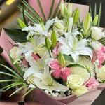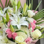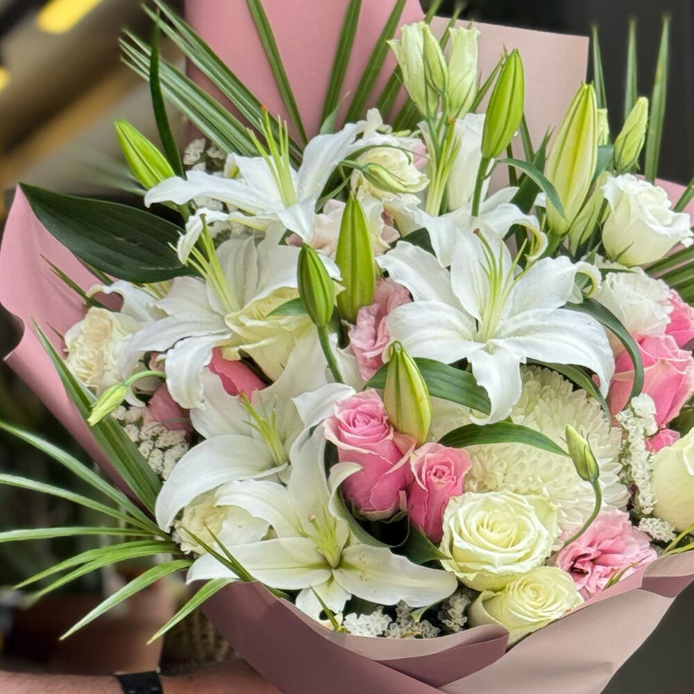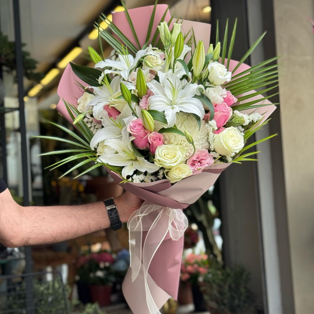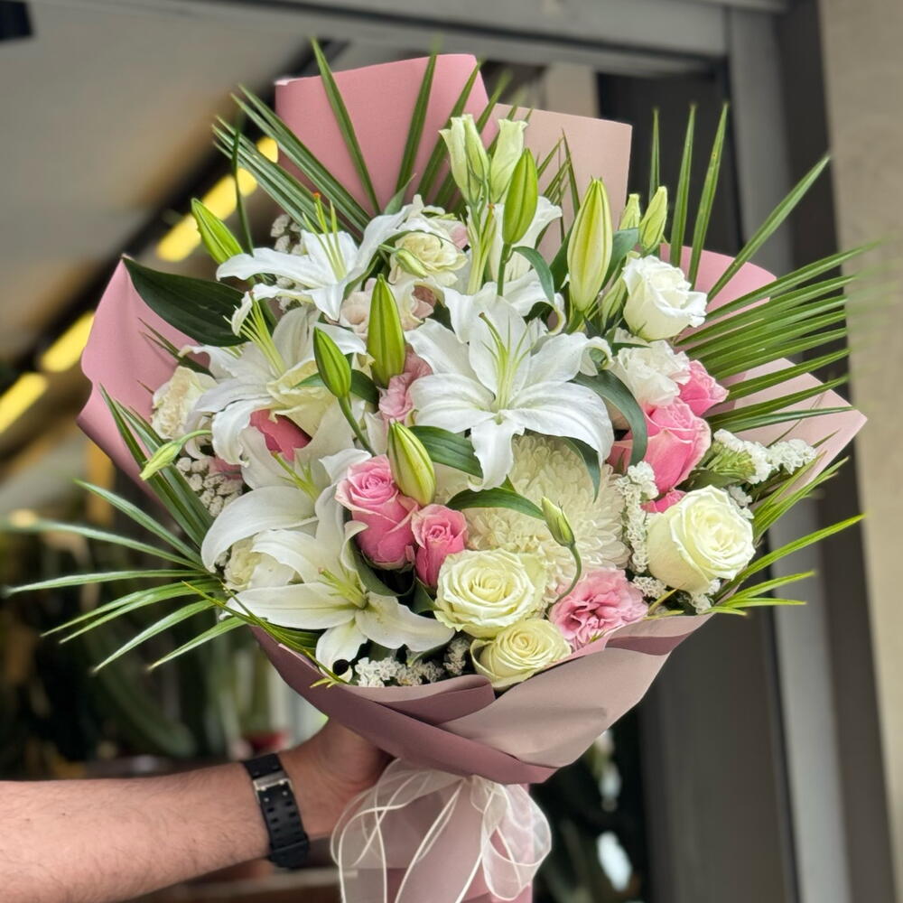 İlk Bakışta Etkileyen Zarafet Mis kokulu beyaz lilyumlar, zarif pembe ve krem güllerle buluştu; her biri hoş geldin demenin en sofistike halini yansıtıyor. İster özel bir misafiri karşılayın, ister sevdiğinize duyduğunuz derin sevgiyi ifade edin… Bu büyüleyici buket, ilk izlenimin unutulmaz olmasını sağlar. Ferahlık, zarafet ve içtenlik bir arada. Karşılama anlarını özel bir seremoniye dönüştürür.